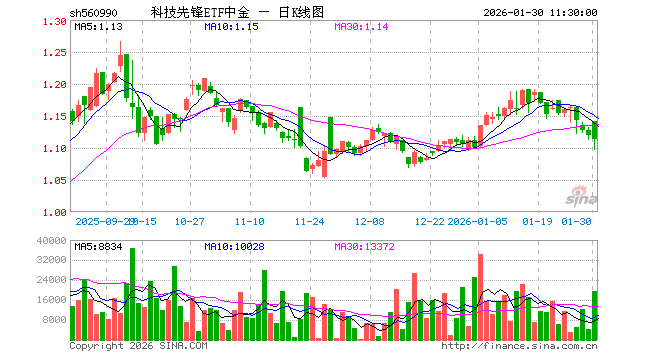 1月30日,截止午间收盘,科技先锋ETF中金(560990)跌0.54%,报1.113元,成交额217.23万元。科技先锋ETF中金(560990)重仓股方面,宁德时代截止午盘涨2.93%,寒武纪涨1.35%,恒瑞医药涨0.29%,药明康德跌1.84%,工业富联跌0.99%,阳光电源涨3.30%,海光信息涨2.31%,立讯精密涨0.73%,中芯国际涨0.14%,北方华创跌0.10%。