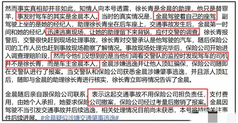 金晨真缺那点保险赔偿? 你说她撞车后,要小助理顶包,自己跑路,可能是不想要有一点负面舆论。 但是这都叫小助理顶包责任,居然还去报保险,这操作也太降智了吧? 1月18号就有人预告爆90花交通事故,轻者凉凉,重者进去。现在实锤是金晨,明显是封口费没谈拢。 事情发酵到现在,金晨全程装死不回应,现在热搜也已经下降了。现在肯定就是打算,只要不回应,那这个事情就不存在。 然后她有那么多待播剧,还有热门综艺,资本都会出来力保她的。等过段日子舆论平息了,还是该干嘛就干嘛。 金晨 金晨综艺
