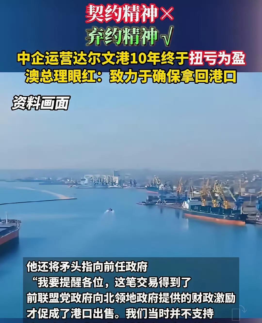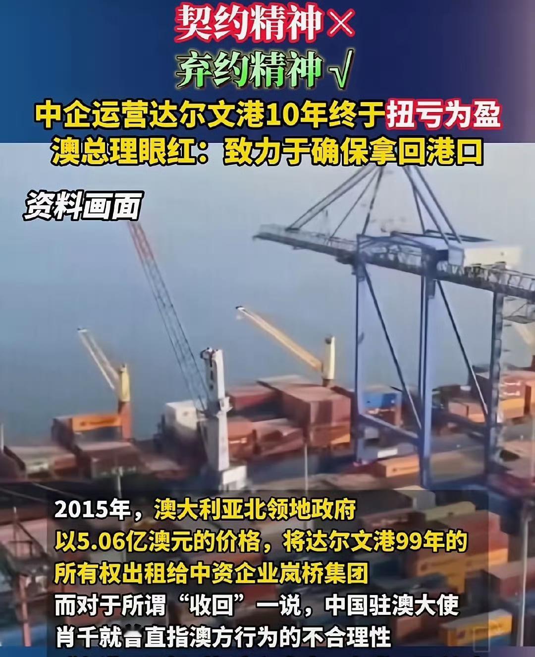 刷到澳大利亚总理阿尔巴尼斯的表态时,我真得佩服这种直白的“强盗逻辑”。被问起何时收回达尔文港,他说得理直气壮,核心意思就一个:这港口现在赚钱了,所以得归我们。这话听着荒诞,却把某些西方国家的处事准则扒得明明白白。 这事得从2015年说起。那时候达尔文港年年亏损,一年亏掉3700万美元,澳大利亚北领地政府扛不住财政压力,才想着全球招标找外资接盘。中国岚桥集团真金白银砸了5.06亿澳元,硬生生拿下99年的租赁权,这可是经过澳联邦和地方两级政府审批的,流程合规得挑不出一点毛病。 接下来的十年,中企没少下功夫。航道加深、泊位扩建、货运系统优化,真金白银投进去,原本冷冷清清的港口慢慢活了过来。吞吐量从500万吨涨到3000万吨,上一财年更是净赚960万澳元,不仅缓解了当地财政赤字,还创造了不少就业岗位。可以说,是中企的运营让这个“包袱”变成了“香饽饽”。 可谁能想到,盈利的消息刚出来,澳大利亚政府就变脸了。阿尔巴尼斯直接放话要“拿回港口”,理由牵强得可笑。之前澳方搞了好几次国家安全审查,结果都明明白白显示,中企运营根本没任何安全隐患,可这些结论全被他们刻意忽略了。说白了,所谓的“国家安全”就是块遮羞布,真实想法就是见不得中企赚钱。 更讽刺的是,这背后全是政治操弄的影子。达尔文港离美军基地不远,美国一直担心中企运营会影响他们的军事部署,没少给澳大利亚施压。而阿尔巴尼斯政府一边想抱紧美国大腿,一边又想讨好国内反华势力,干脆就把商业合作当成了政治筹码。为了撕毁合约,他们甚至修改了《对外投资审查法》,给自己找法律借口,这种操作真是把“契约精神”踩在了脚底下。 网友说西方国家毫无信用,这话一点不假。亏损时求着外资来救场,盈利了就翻脸不认人,这种只许自己占便宜的做法,根本不是做生意的规矩。中国驻澳大使肖千说得好,亏损时出租,盈利时收回,这在道义上根本站不住脚。而且中方也不是没准备,国际仲裁、贸易反制、投资调整,手里的筹码多着呢。真要闹到撕破脸的地步,澳大利亚损失的可不止是一笔港口收益,而是整个国家的国际信誉。 现在阿尔巴尼斯还在硬撑着说要“致力于拿回港口”,可他心里未必不清楚后果。且不说赔偿金额可能高达数十亿澳元,一旦破坏了投资环境,以后谁还敢去澳大利亚投资?说到底,这种见利忘义的操作,最终只会搬起石头砸自己的脚。