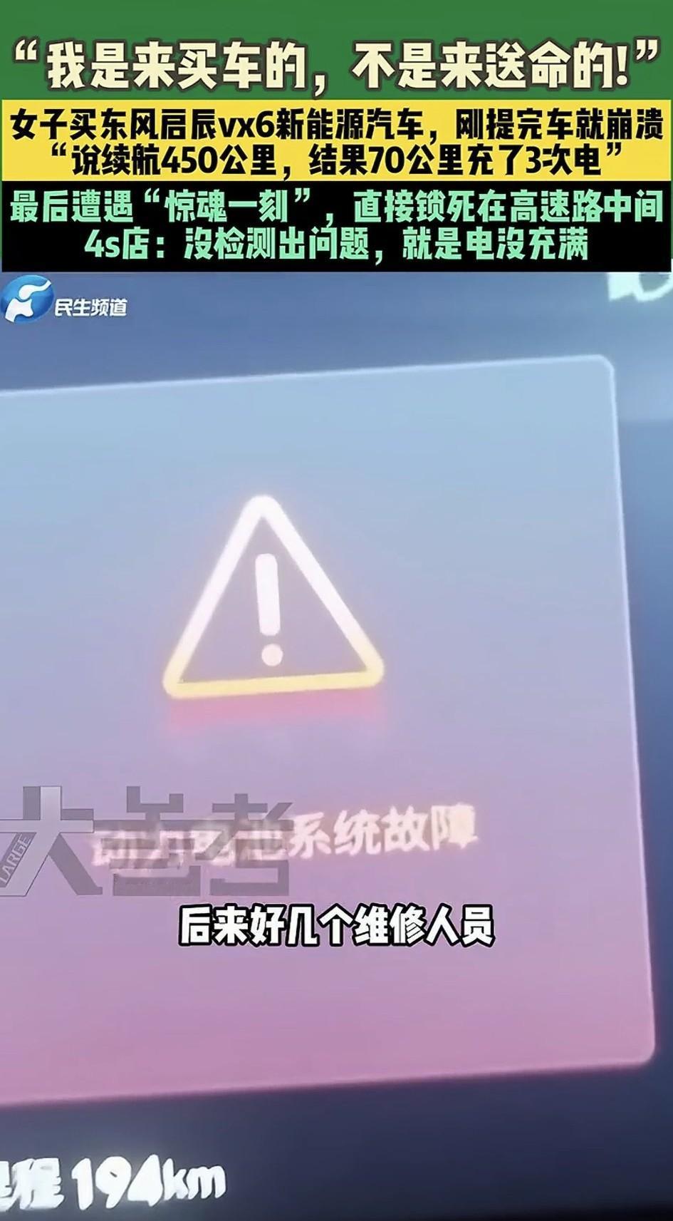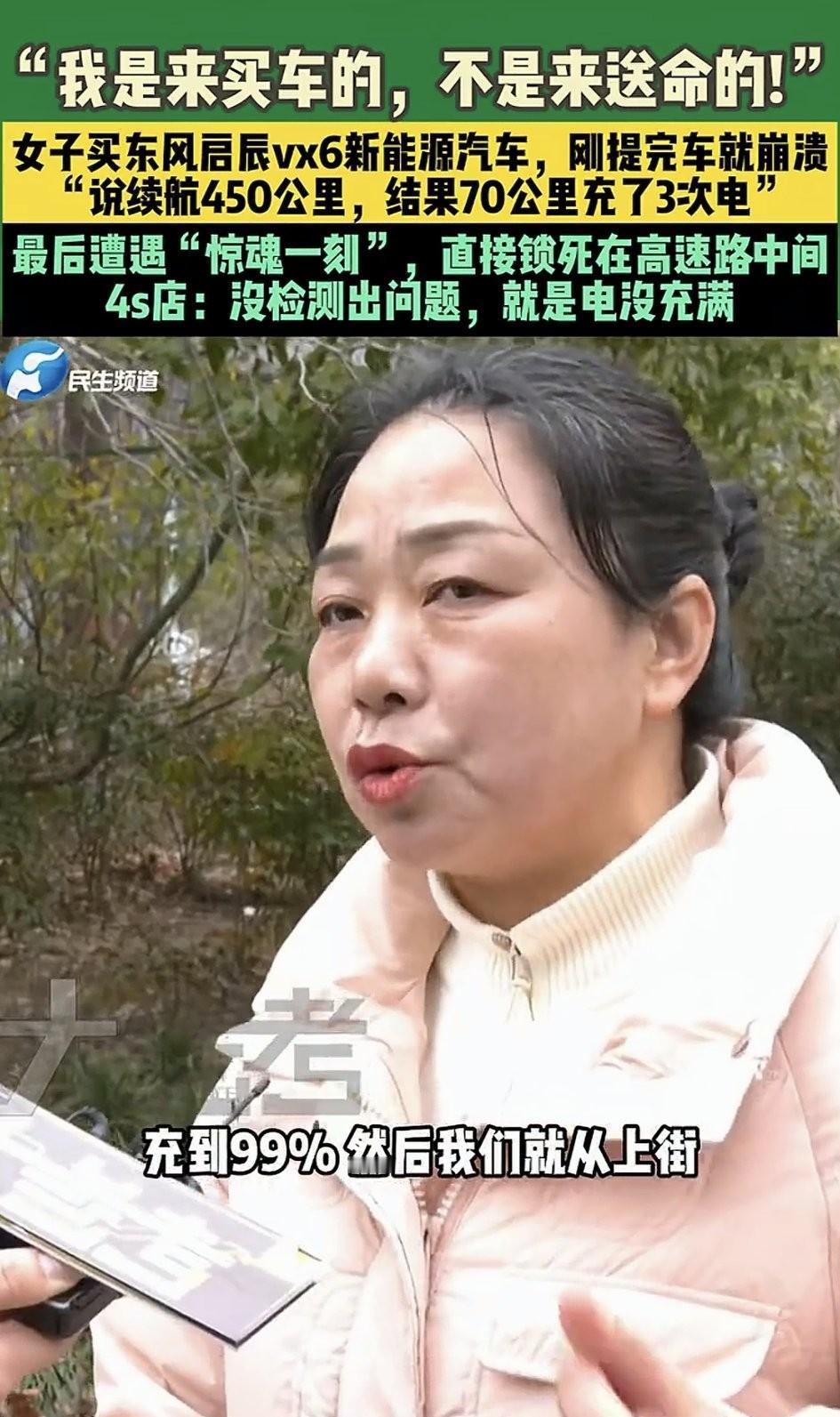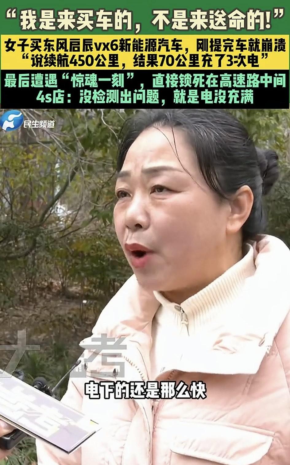“当时真是吓死我了”!河南郑州,一女子买了一辆新能源汽车,销售说是这车充满电后的续航是450公里,结果女子驾车出行70公里竟充了3次电,最后更是遭遇突然没电,直接锁死在高速路中间,差点出了事故。 据女子描述,她当时用车前,将电充到了97%才上的路,但开车过程中,车子电量则哗哗掉,庆幸第一次没电时,女子正好开到一个充电桩处。 于是女子又把车充电到99%才上了高速,结果上了高速后,这电依然掉得飞快,等来到下一站时,车子只有30%的电了。 后来几个维修员给女子调整了车后,车子掉电速度终于慢了,但让女子没想到的是,当其开车又上高速时,车本身还有60%电量,结果却在高速路中间突然停住了! 且此时正是晚上七八点,车流量很大的时候,女子看着这车来车往的高速路上,也吓得赶紧启动车子,但无论她如何操作,这车始终没有动静。 无奈,女子只得赶紧下车,最后还是叫了拖车将车拖回来的。可事后女子找到4s店售后,售后却说,是因为车电没有充满导致的,他们已经检测过车了,没有任何问题。 于是女子向媒体求助维权,并生气的表示:这车都开不回家,还是拖回去的,这叫没问题吗?当时真是吓死我了!我是来买车的,不是来送命的呀! 对此有网友就表示:买电车不能买杂牌,优选如下比亚迪、华为问界、小鹏、理想、蔚来、广汽埃安,其他牌子就要看运气了。 还有网友表示:总之我是不会买电车,我买的油车,现在油价四块八一升,加一箱油两百块钱跑几百公里,还不怕开空调,比新能源汽车省心多了! 也有网友表示:这电车要冲水电,不能冲火电,火电都是烧煤杂质多,电不纯,所以续航拉胯。总之,电动车现在的状态,像极了零几年那会儿山寨手机横行遍地的时候,还得是技术没成熟。 不得不说,买车本是享受的,结果却买了一个烦恼,还差点出了事故,这谁遇到不生气。看来买车需谨慎啊,正如修车的网友分享,选择可靠的大品牌,或是看大街上跑得最多的是啥车,你就买啥车,准没错! 对此大家怎么看?