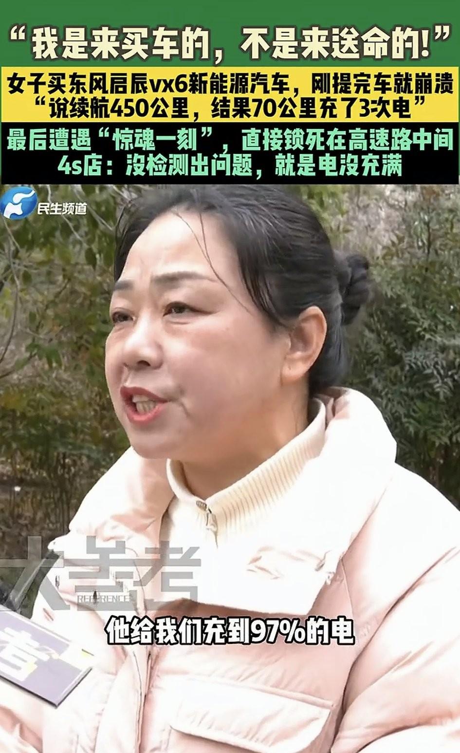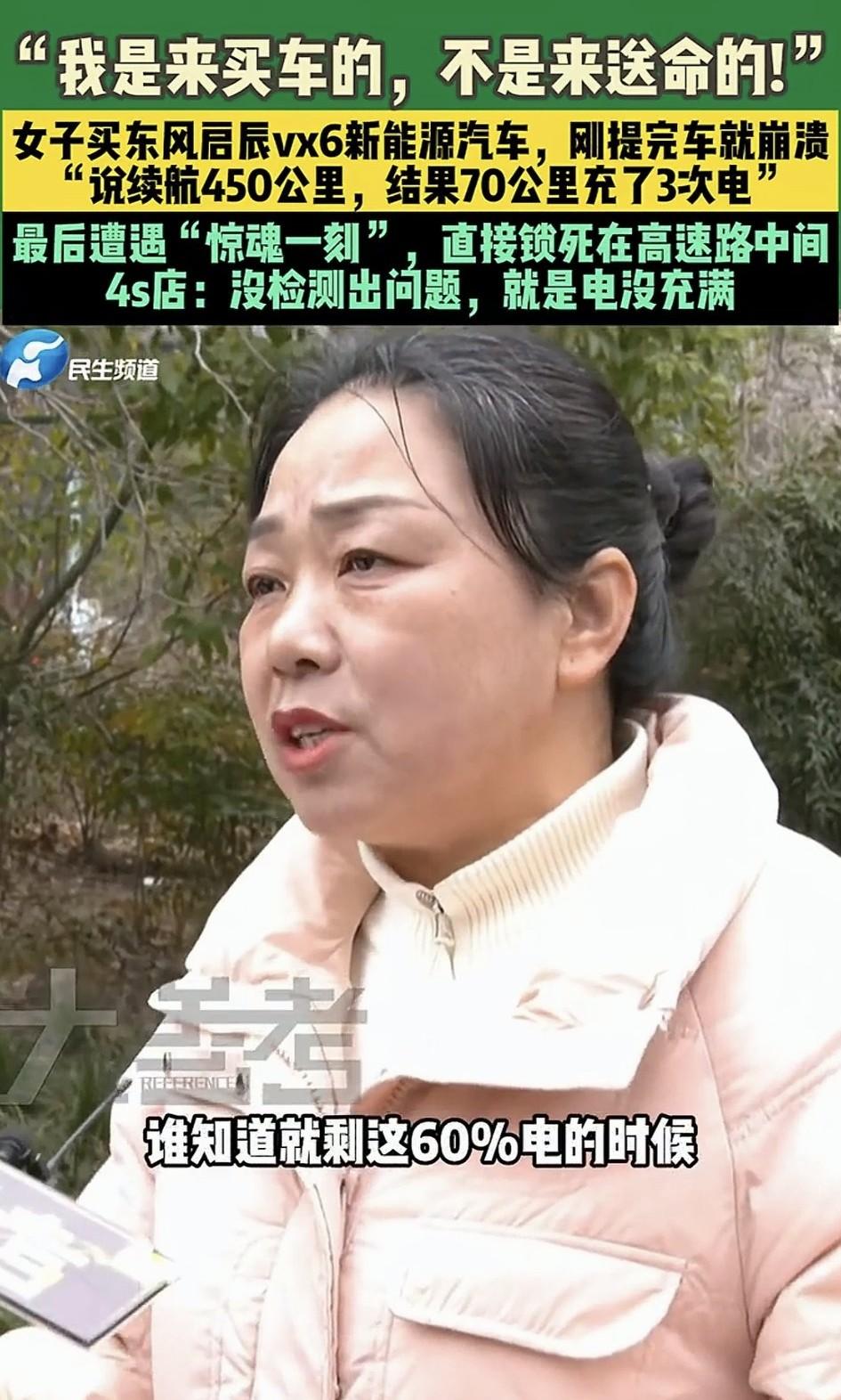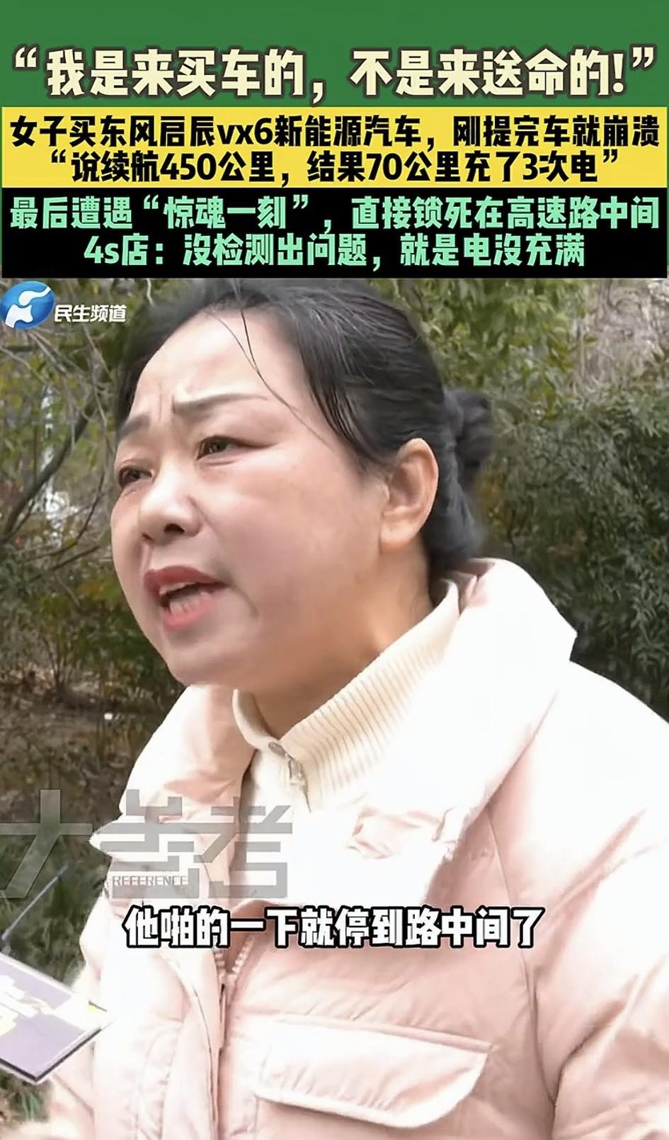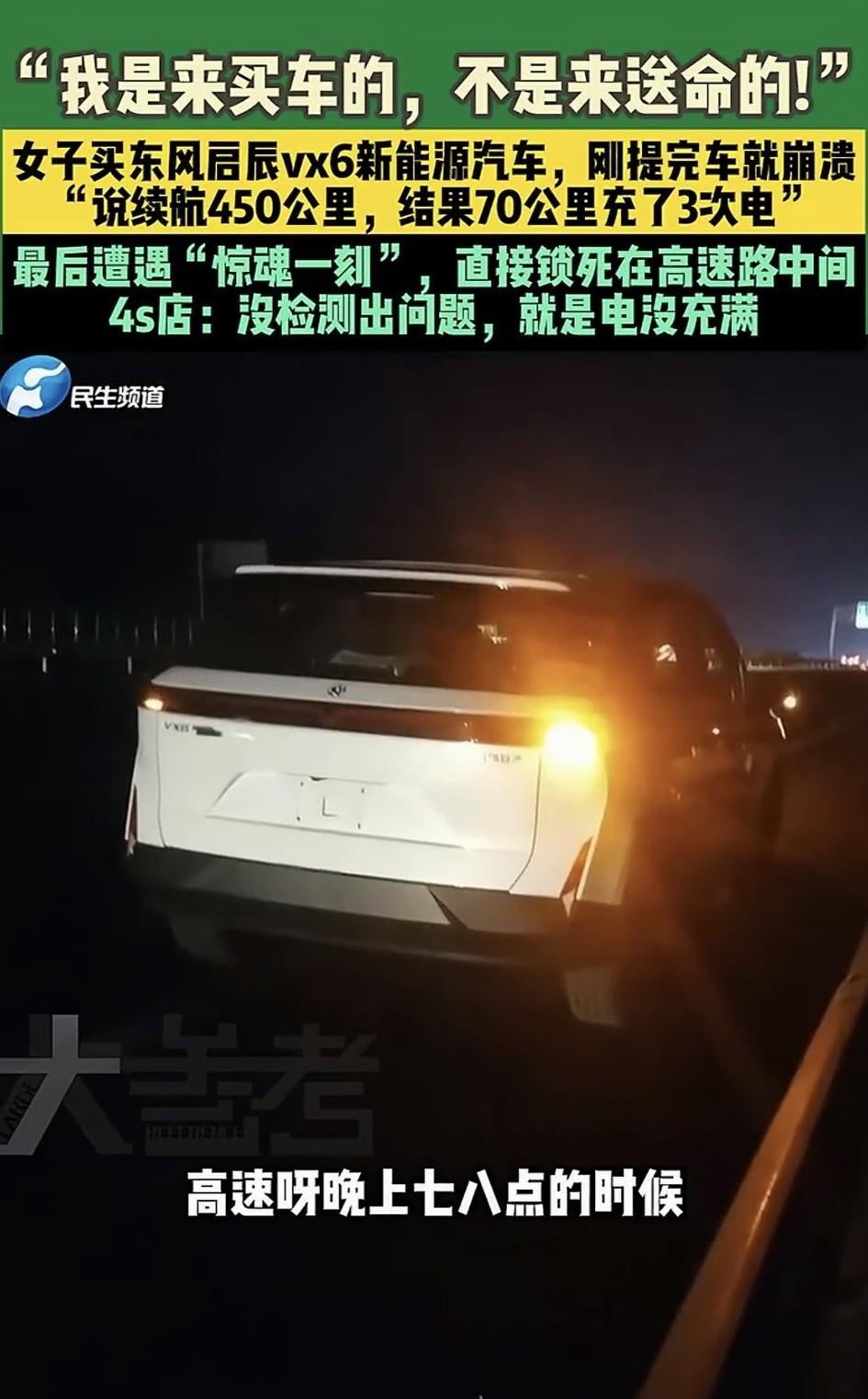 “当时真是吓死我了”!河南郑州,一女子买了一辆新能源汽车,销售说是这车充满电后的续航是450公里,结果女子驾车出行70公里竟充了3次电,最后更是遭遇突然没电,直接锁死在高速路中间,差点出了事故。 据女子描述,她当时用车前,将电充到了97%才上的路,但开车过程中,车子电量则哗哗掉,庆幸第一次没电时,女子正好开到一个充电桩处。 于是女子又把车充电到99%才上了高速,结果上了高速后,这电依然掉得飞快,等来到下一站时,车子只有30%的电了。 后来几个维修员给女子调整了车后,车子掉电速度终于慢了,但让女子没想到的是,当其开车又上高速时,车本身还有60%电量,结果却在高速路中间突然停住了! 且此时正是晚上七八点,车流量很大的时候,女子看着这车来车往的高速路上,也吓得赶紧启动车子,但无论她如何操作,这车始终没有动静。 无奈,女子只得赶紧下车,最后还是叫了拖车将车拖回来的。可事后女子找到4s店售后,售后却说,是因为车电没有充满导致的,他们已经检测过车了,没有任何问题。 于是女子向媒体求助维权,并生气的表示:这车都开不回家,还是拖回去的,这叫没问题吗?当时真是吓死我了!我是来买车的,不是来送命的呀! 对此有网友就表示:买电车不能买杂牌,优选如下比亚迪、华为问界、小鹏、理想、蔚来、广汽埃安,其他牌子就要看运气了。 还有网友表示:总之我是不会买电车,我买的油车,现在油价四块八一升,加一箱油两百块钱跑几百公里,还不怕开空调,比新能源汽车省心多了! 也有网友表示:这电车要冲水电,不能冲火电,火电都是烧煤杂质多,电不纯,所以续航拉胯。总之,电动车现在的状态,像极了零几年那会儿山寨手机横行遍地的时候,还得是技术没成熟。 不得不说,买车本是享受的,结果却买了一个烦恼,还差点出了事故,这谁遇到不生气。看来买车需谨慎啊,正如修车的网友分享,选择可靠的大品牌,或是看大街上跑得最多的是啥车,你就买啥车,准没错! 对此大家怎么看?