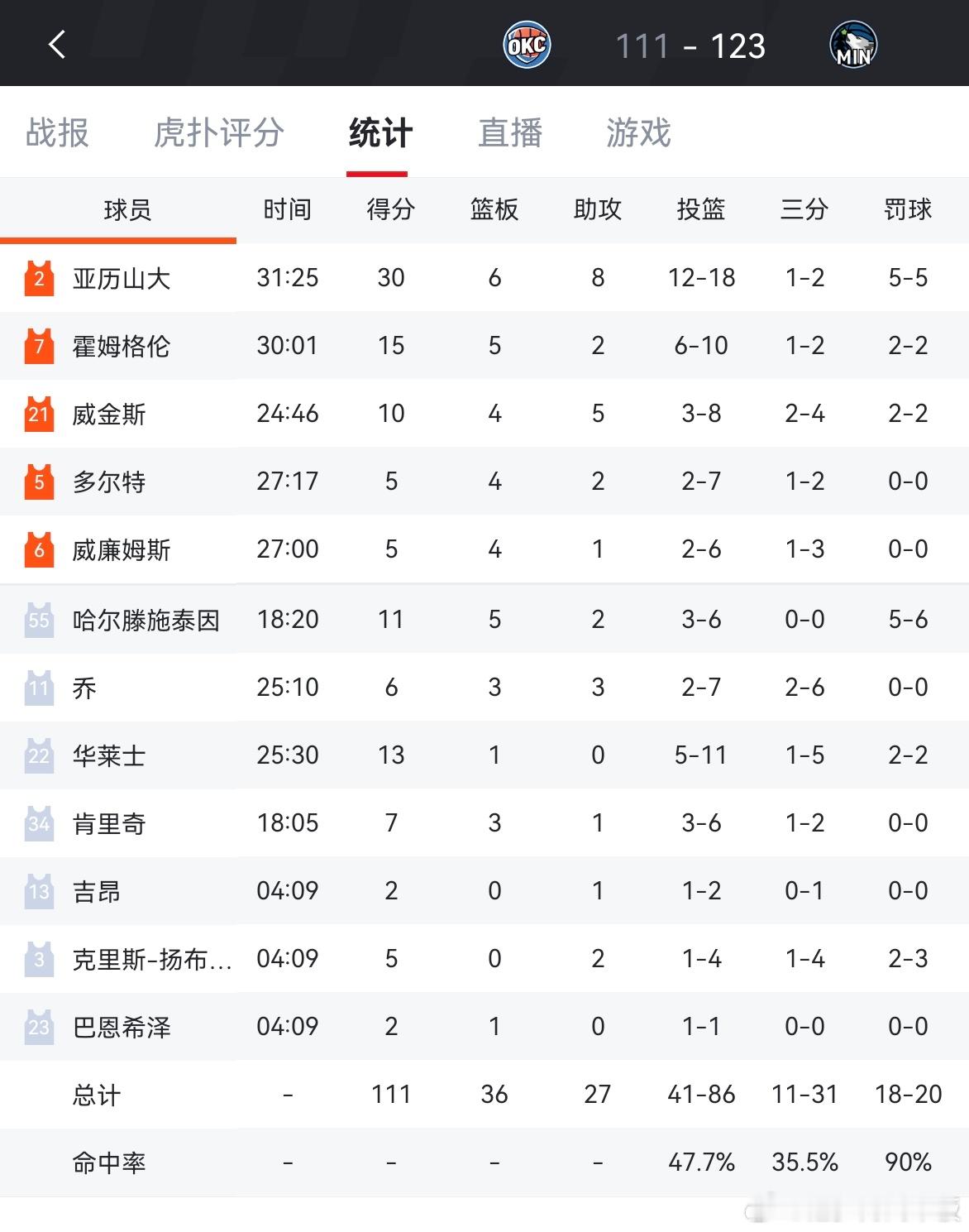 森林狼123-111大胜雷霆,爱德华兹26分,亚历山大30分森林狼和马刺是本赛季