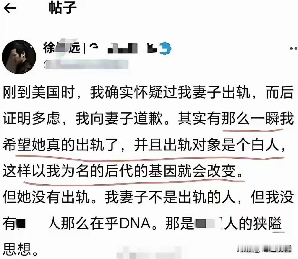 这究竟是一种什么思想? 竟然为自己的妻子,没有出轨白人而感到惋惜。 在他的心底里,倒是希望自己妻子出轨,这样以自己名义的后代基因就会改变,变成了他是所崇拜的白人血统。 作为一个普通人,真的不理解这种思想是什么境界?这难道属于大爱无私?