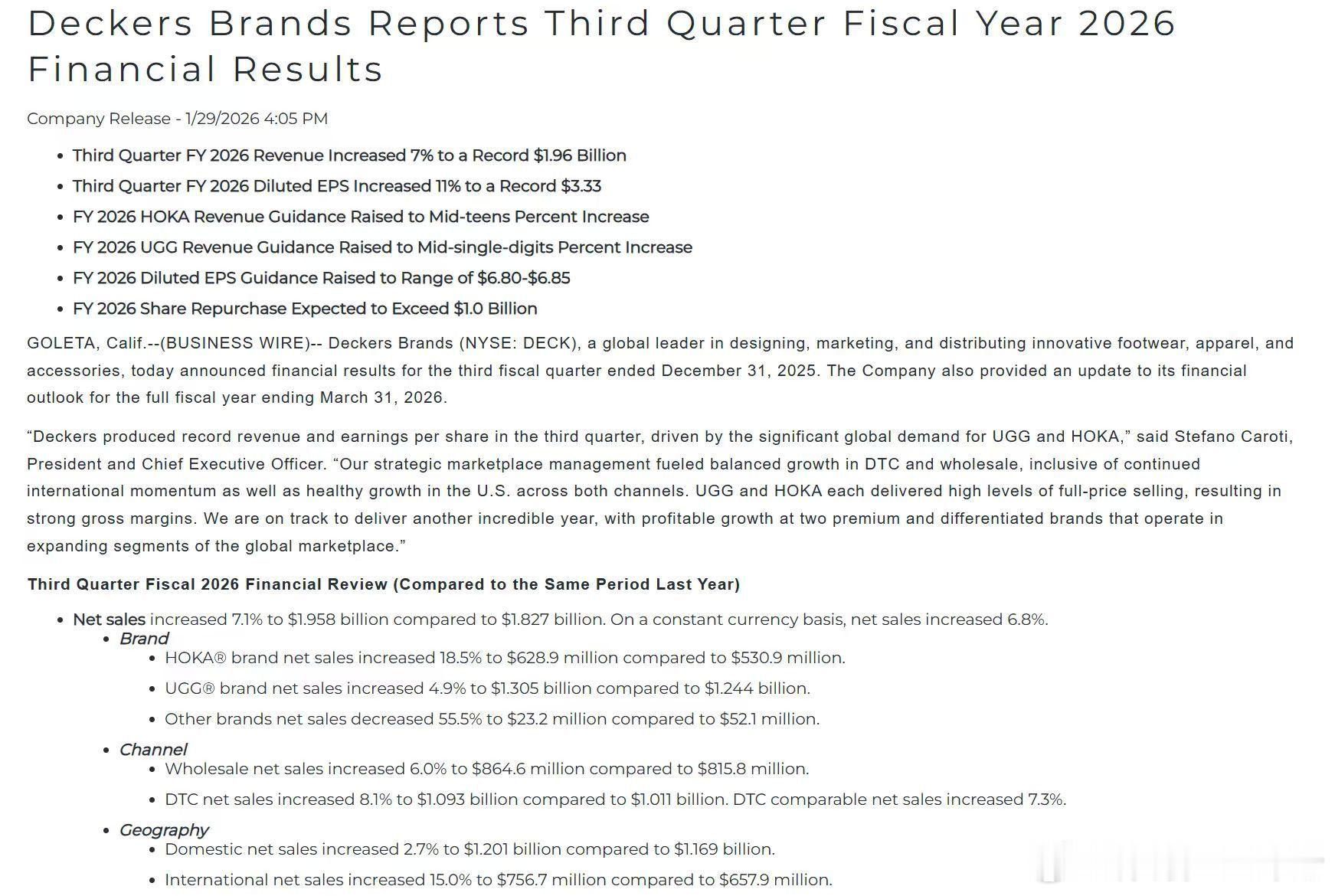 根据2026年第三季度财报,看到HOKA品牌净销售额增长了18.5%,直接创纪录达到6.289亿美元,甩开德克斯集团整体增速一大截。