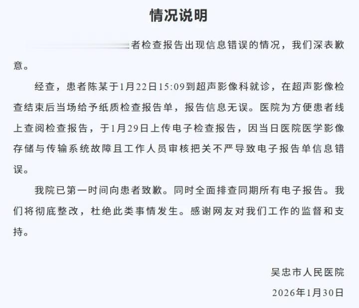 关于网民反映医院患者检查报告出现信息错误的情况,吴忠市人民医院深表歉意。