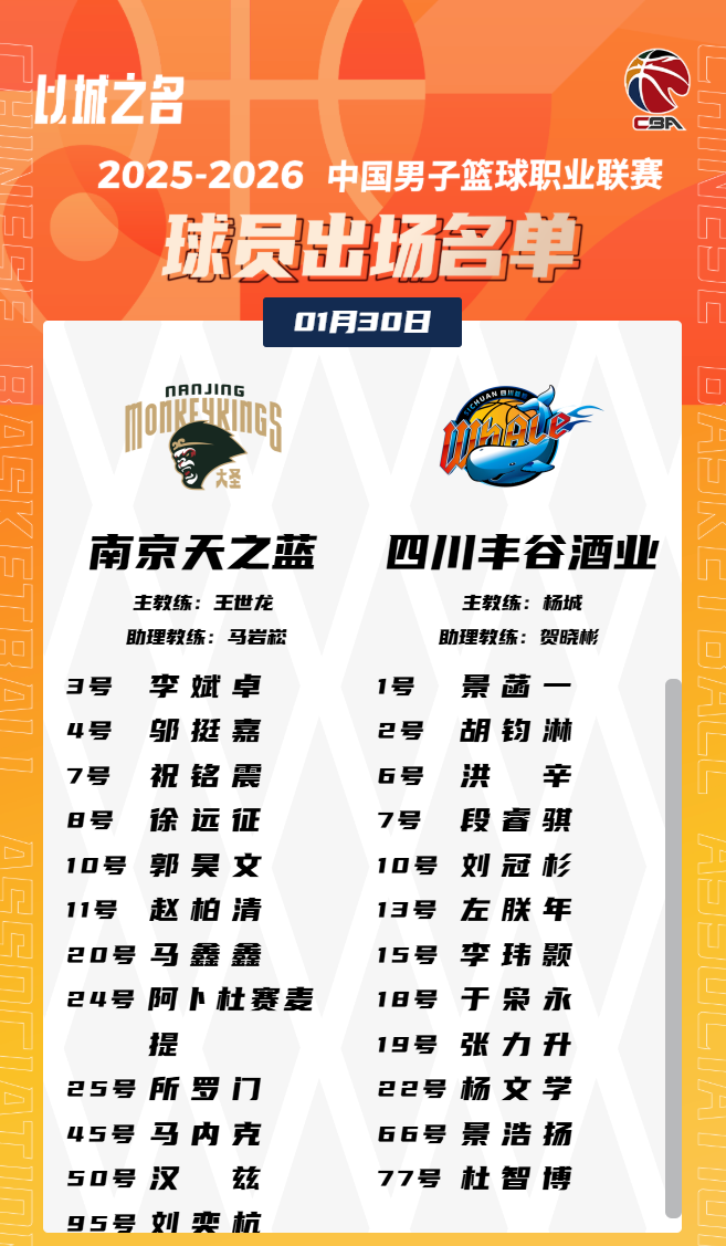 虎扑01月30日讯今晚CBA常规赛,四川对阵南京的大名单已经出炉。