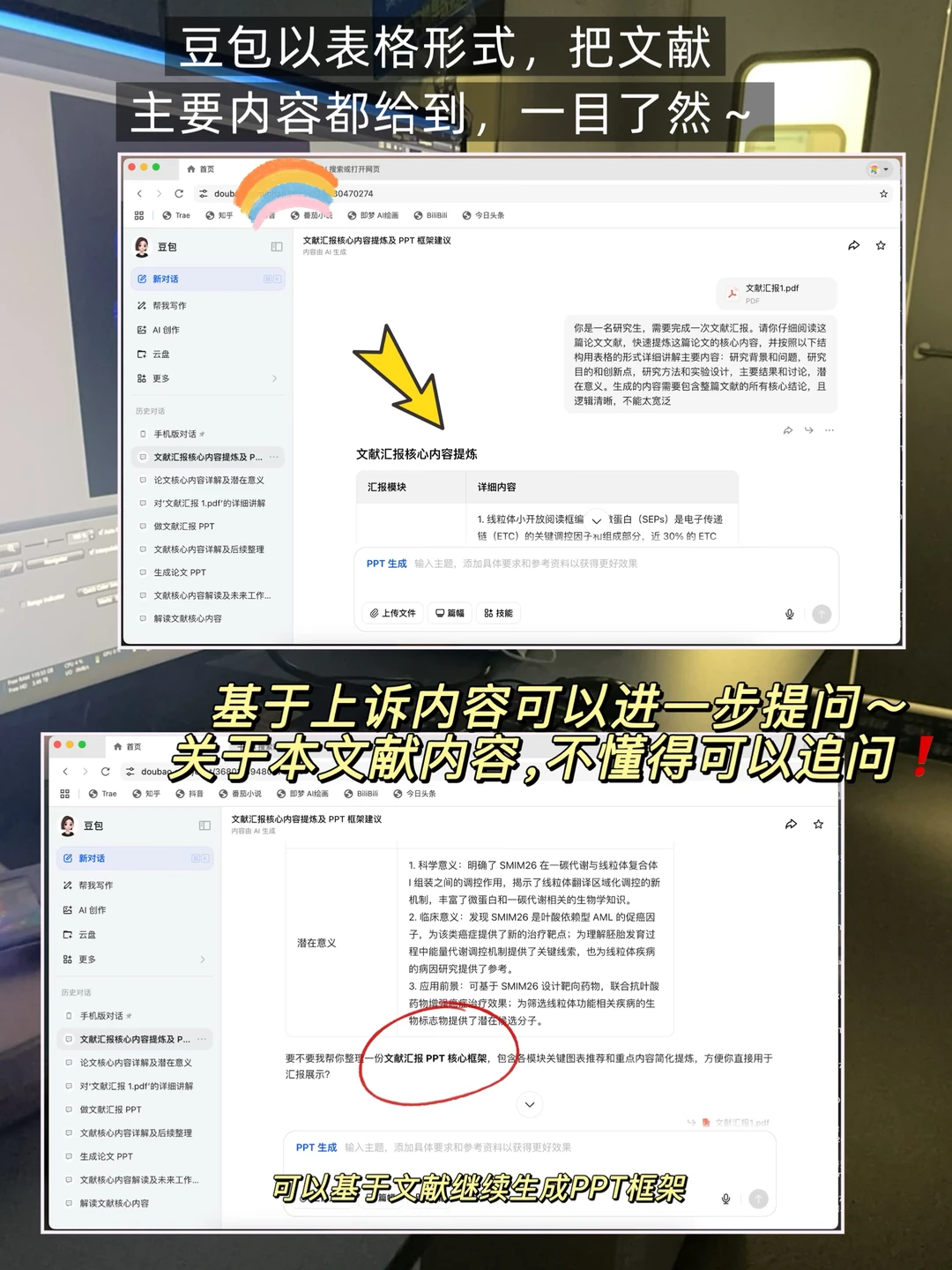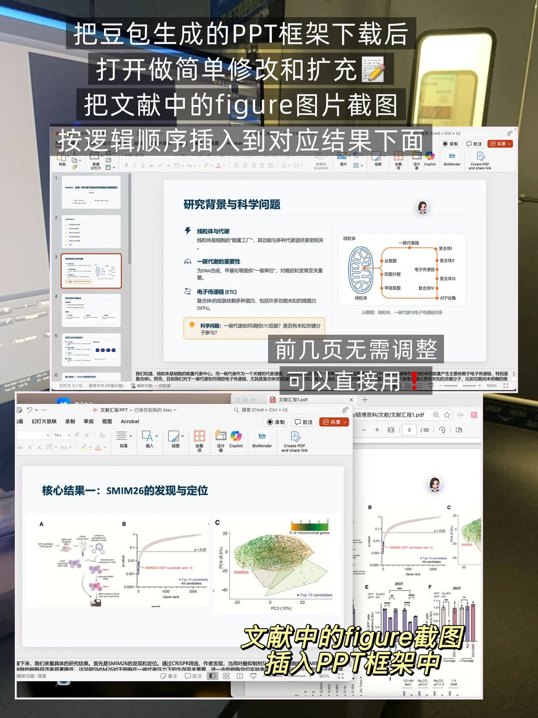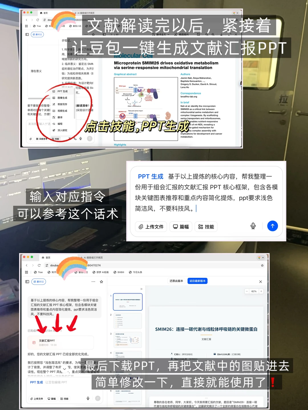 ➡️然后再让🫘根据解读的文献内容生成PPT大纲,指令看图中文字,下载以后把文献中对应的figure图片插进去就行啦,这样一通下来,做一次文献汇报就很快❗️