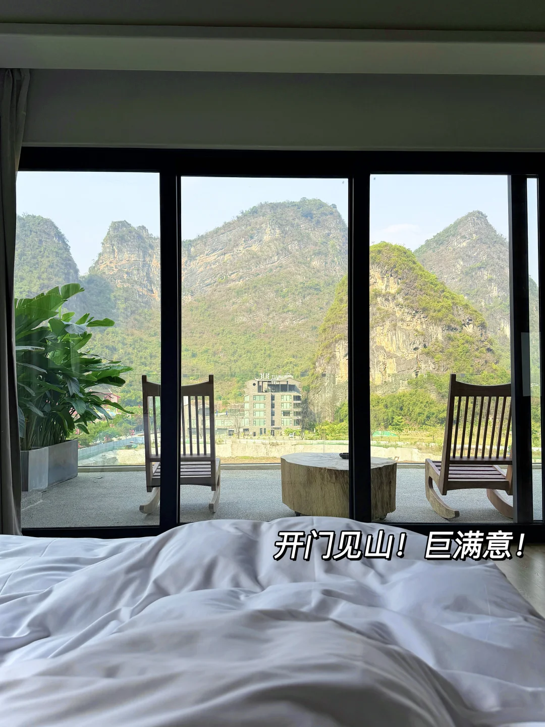 刚退房!!!太美了。。。 开门见山,360°超大落地窗、真心是把桂林山水搬进了房间里啊啊啊!! 去桂林阳朔玩的,答应我! 都去住这家酒店: 沐野山墅!!