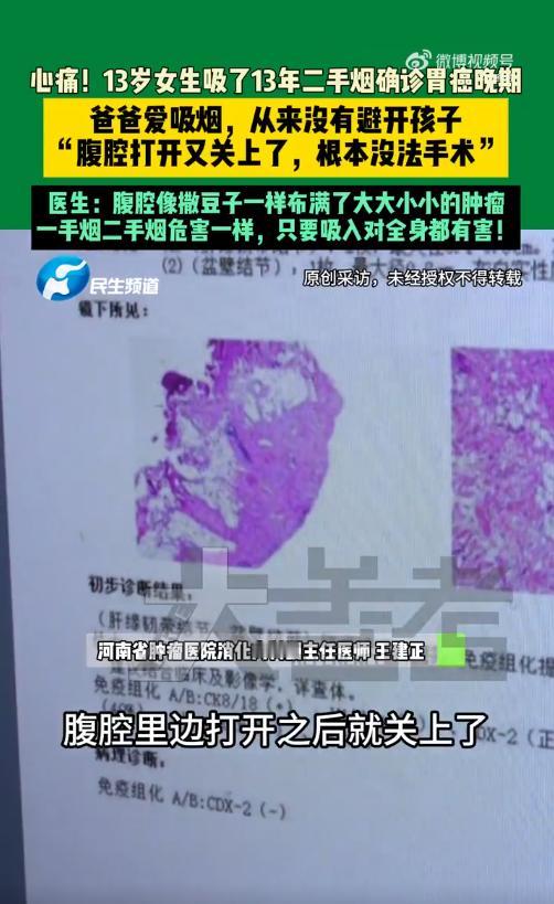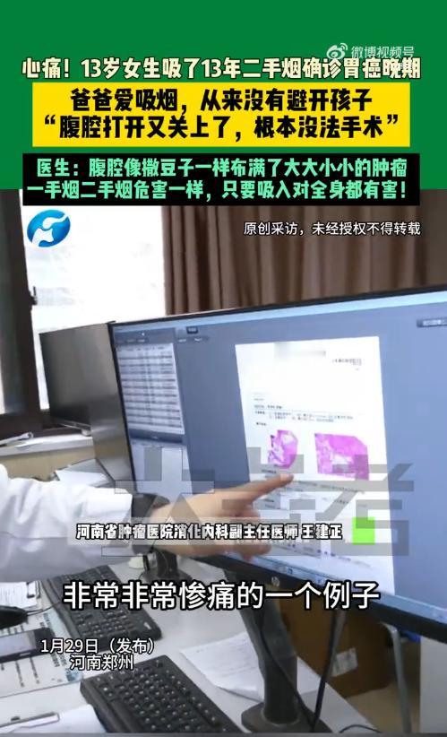 13岁女孩确诊胃癌晚期,医生:腹腔布满大大小小的肿瘤,没有任何治愈机会 近日,河南省肿瘤医院消化科接诊了一名年仅13岁的胃癌晚期女孩,消息令人痛心。据医生描述,女孩腹腔布满了大大小小的肿瘤,全身多发转移,手术时腹腔打开又无奈关闭,已无任何治愈机会。而这一切的“元凶”,竟是女孩爸爸常年在家吸烟,且从未避开过孩子。 二手烟,也叫被动吸烟,包含侧流烟和主流烟,其中侧流烟毒性更强,含有更高浓度的一氧化碳、尼古丁、焦油和多种致癌物。二手烟对孩子的危害是多方面的。它会损伤呼吸道纤毛功能,使孩子更容易患上反复呼吸道感染、哮喘等疾病;还会抑制免疫细胞活性,让孩子抵抗力下降,更易生病;尼古丁会干扰生长激素分泌,影响孩子骨骼和神经系统的正常发育;烟草中的神经毒素还可能影响孩子大脑发育,导致记忆力减退、学习能力下降。长期暴露在二手烟环境下,孩子未来吸烟的风险也会增加。 对于胃癌而言,虽然儿童胃癌极其罕见,但二手烟中的致癌物长期作用,可能损伤胃黏膜,破坏黏膜屏障,增加胃炎、溃疡甚至胃癌的风险。这起悲剧再次警示我们,二手烟的危害与一手烟无异,只要吸入,对全身都有害。 为了孩子的健康,家长们应彻底戒烟,或至少不在孩子面前吸烟,给孩子一个100%无烟的环境。