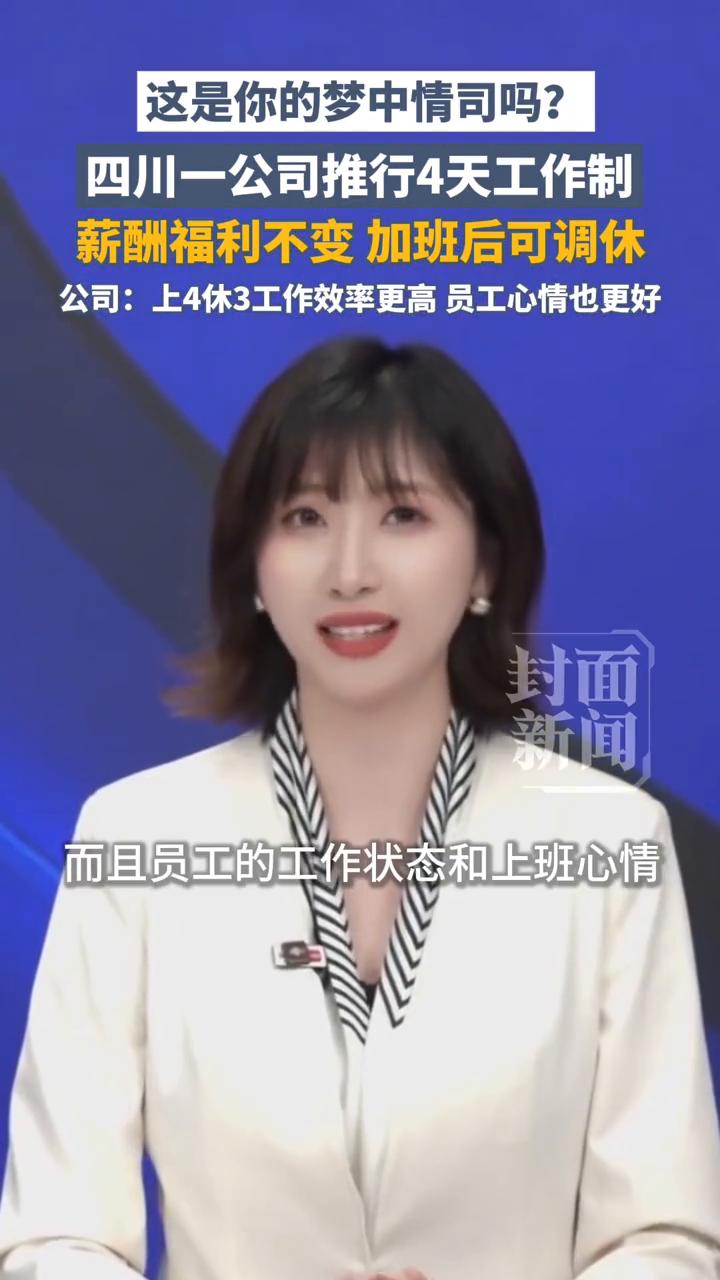 这是你的梦中情司吗?四川一公司推行4天工作制,薪酬福利不变,加班后可调休。公司:上4休3,工作效率更高,员工心情也更好。 封面新闻。 每周只上四天班,想都不敢想的事竟然真的实现了。近日,四川京元集成电路有限公司宣布,2月1日起实行每周四天工作制,法定周末正常双休,周五带薪休假,员工薪酬福利等待遇保持不变。员工们得知后,当晚就一起聚餐庆祝。 公司法人代表透露,经数月试点,四天工作制的有效产出超过五天,而且员工的工作状态和上班心情也变得更好。同时公司明确,休息日加班需提前审批,可依规调休。