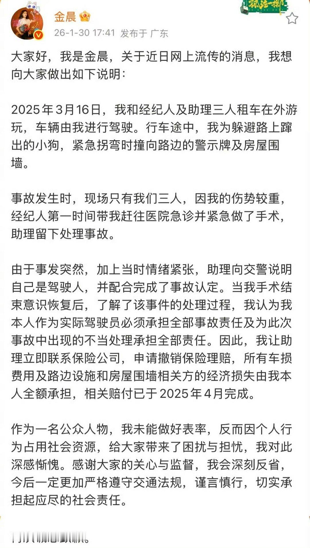 金晨发文道歉说自己助理当时太紧张才说自己是驾驶人并在评论区发了自己受伤严重的图片