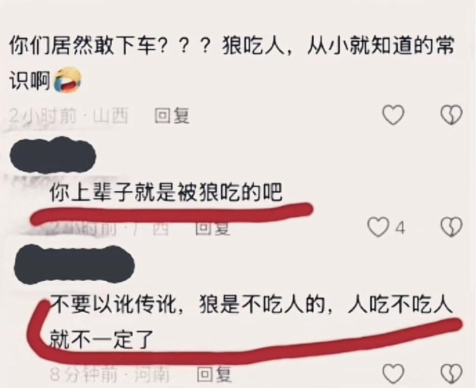 让6岁女儿近距离投喂野狼火腿肠?距离近到头皮发麻。 前几天刚刷到有人和雪豹近距离拍照被咬的,今天又刷有宝妈让6岁的孩子近距离投喂野狼,而宝妈还在后边笑嘻嘻举着手机录像,这简直是现实版舍不得孩子套不着狼。 就在1月28号,青海玉树的可可西里无人区中一宝妈带着6岁的孩子出来旅游,看到过来讨食投喂网红狼后,居然把车停在了无人区路边,带着女儿就直接下了车。随后让孩子拿着火腿肠吸引野狼过来近距离投喂。 当时野狼和孩子的距离有多近?可以说几乎是贴近到孩子的脚边进食,这个距离已近到一旦野狼失控去咬孩子,那是完全来不及躲避。而这位宝妈却一点也不担心,反而全程笑嘻嘻的举着手机录像。这也就幸亏6岁女孩没事,但凡狼把她当成小零食叼走了,这位宝妈估计转头就得大闹青海文旅,质问为什么要在无人区饲养野生狼。 事后这位亲妈还把视频发布到网上,配了一个十分欢快的bgm,很快视频就引起了网友们热议,多数网友纷纷责怪这位宝妈不该让孩子近距离投喂野狼。但不乏也有人评论说:“野狼不吃人”。咱就是说你是狼吗?你咋就知道它不吃?要是真出事了你负责吗?