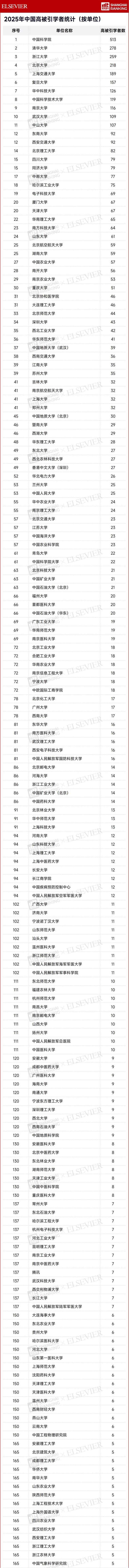 研究论文被广泛援引,体现学者成果在学术界甚至产业界的认可度。旗下出版《柳叶刀》《细胞》等2800多种学术期刊的爱思唯尔(Elsevier),1月30日发布2025“中国高被引学者”(HighlyCitedChineseResearchers)榜单。这份榜单基于爱思唯尔旗下全球权威的引文与索引数据库Scopus,并采用软科开发的方法,系统性呈现中国学者在不同学科领域内的科研贡献与创新价值。