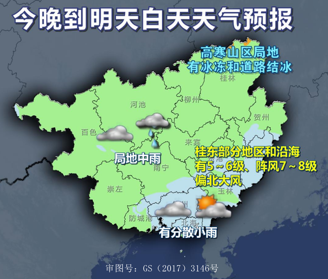今天晚上到明天白天,桂林、柳州、贺州、河池、百色、来宾、南宁、崇左等市阴天有小雨、局地中雨,其它地区阴天到多云有分散小雨。高寒山区局地有冰冻和道路结冰。桂东部分地区和沿海有5~6级、阵风7~8级偏北大风。最低气温:高寒山区-3~3℃,桂东北3~7℃,沿海14~18℃,其它地区8~14℃。