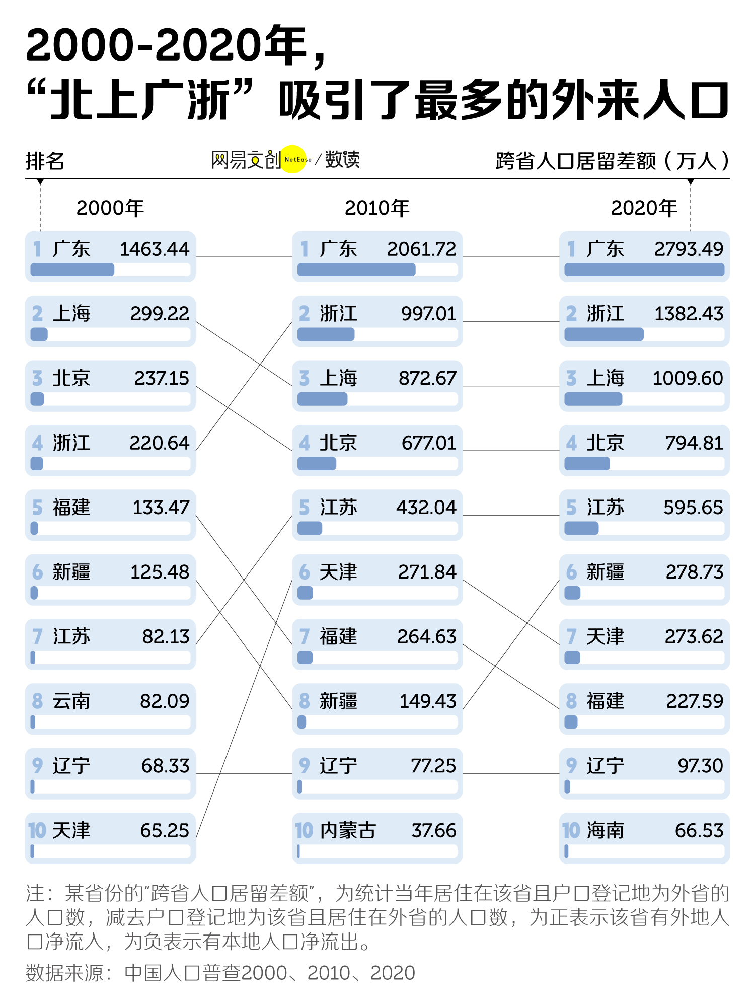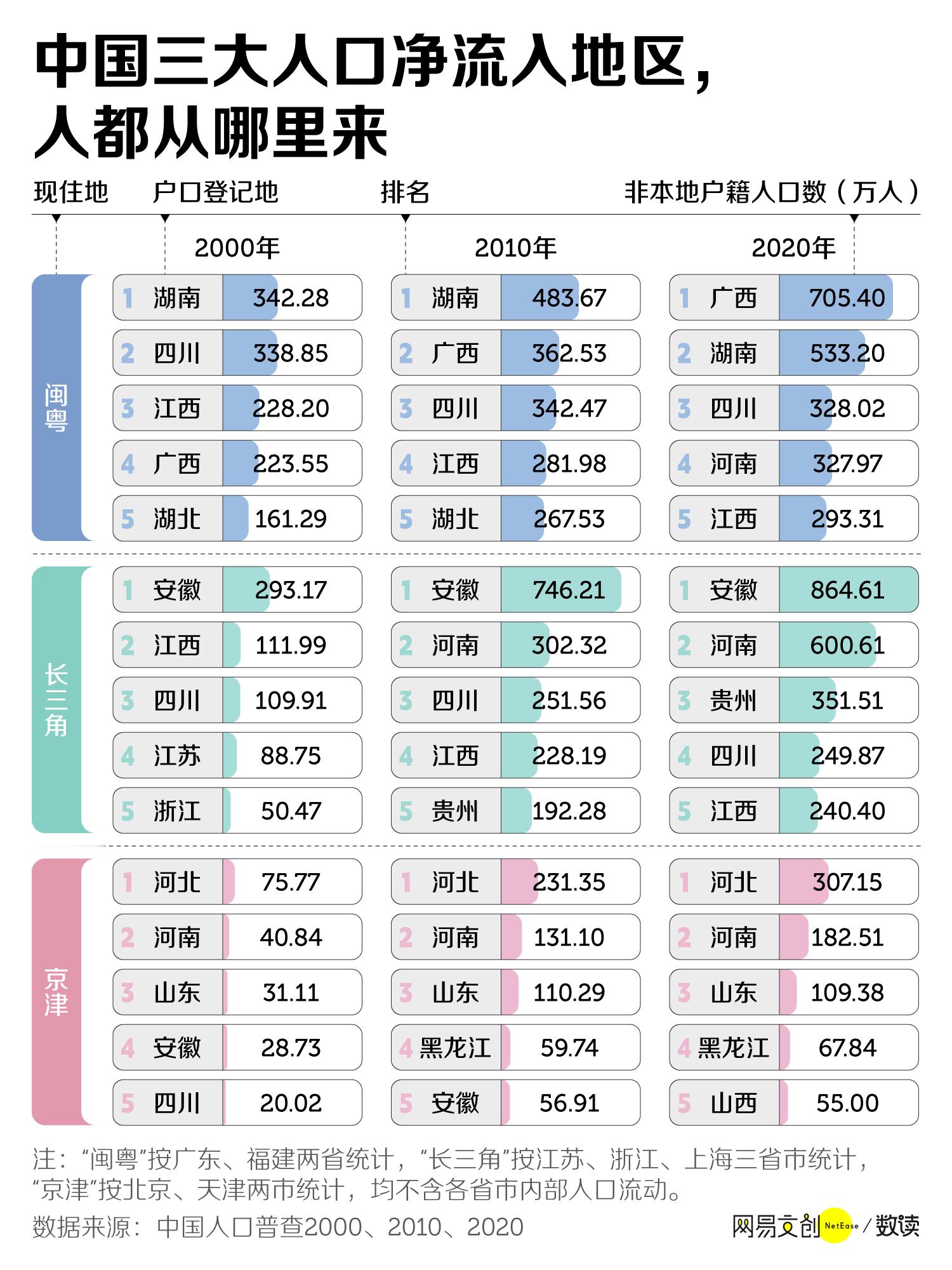 中国人口大迁徙:1、流出最多是河南安徽四川这些,东三省居然不在列,而且辽宁居然是稳定的排在流入第九,不可思议,那当地人口剧烈下降是真的不生造成的了2、流入最多是北上广浙容易理解,新疆居然这么多流入都去干嘛了,摘棉花?当然同样的疑问是这么多人跑去辽宁干嘛?