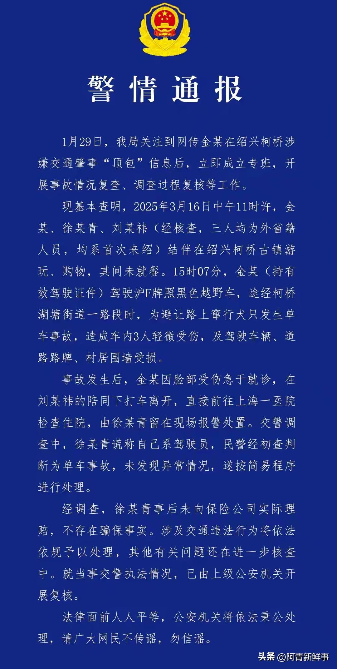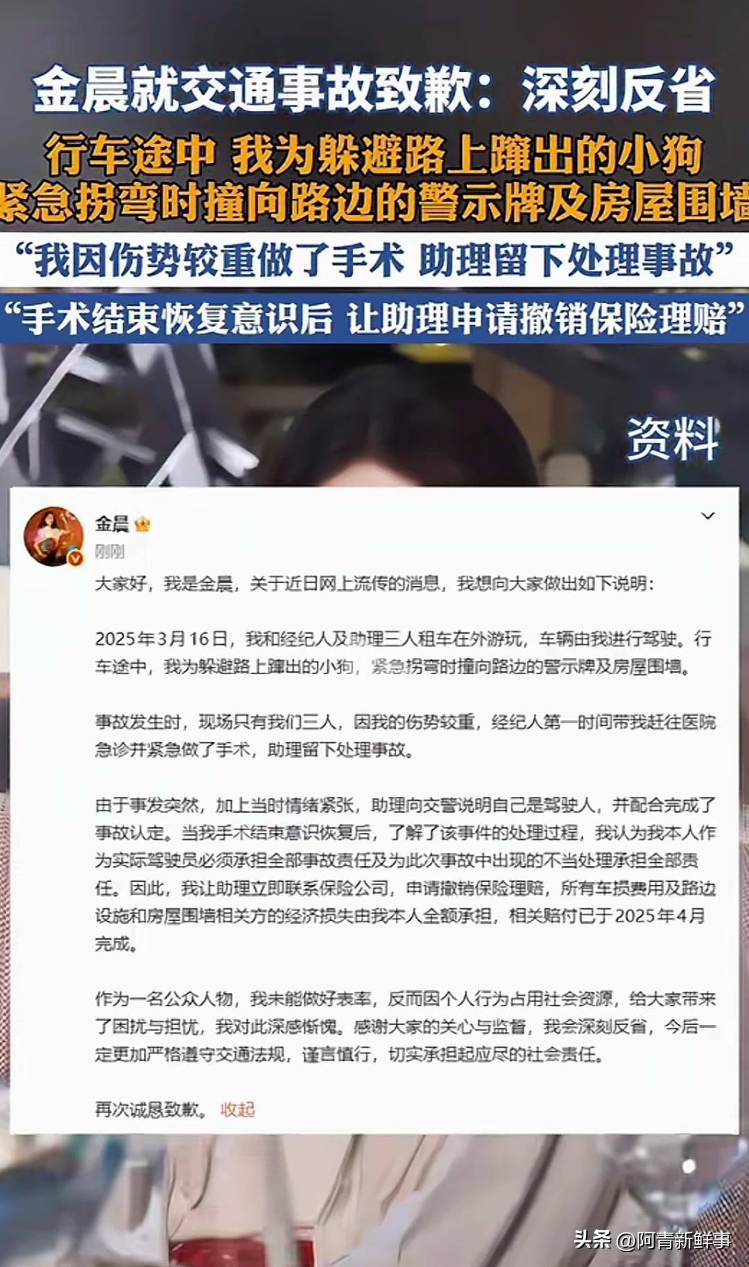 金晨肇事让助理顶包?警方通报出炉,细节太意外 刚刷到柯桥警方的通报,手里的手机都停住了,这事儿反转也太突然了! 2025年3月的事故,现在才被曝光,金晨驾车避让小狗撞了围墙,脸部受伤流了不少血。 她着急就医先离开,助理竟一时紧张谎称自己是司机,这操作真是让人看不懂。 好在金晨术后立马纠正,撤了保险理赔,自己全额赔付了损失,还公开道歉认错。 警方也说了,不存在骗保,就是单纯的交通违法,会依法处理。 其实吧,谁都可能遇到突发情况,但顶包这事儿真不应该,尤其是公众人物。 犯错不可怕,逃避责任才最掉好感,主动担责这点还算拎得清。 不管是明星还是普通人,交通规则面前都该一视同仁,你觉得这次金晨的处理合格吗? 金晨 警方通报 顶包事件 公众人物应守交通法规 明星犯错如何担责