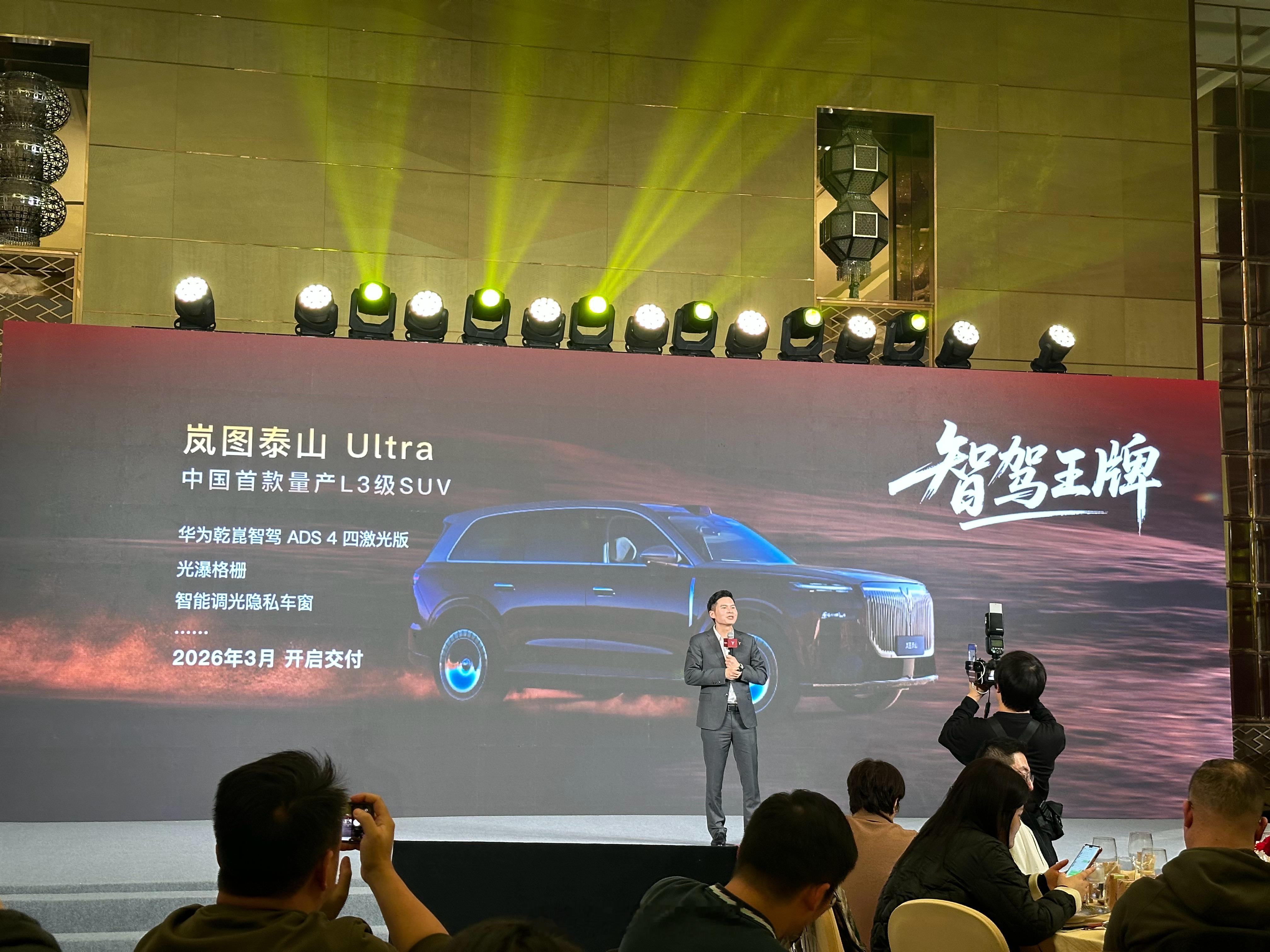 不过扣个细节:2026年上半年开启交付的泰山Ultra 搭载的是 “L3级”辅助驾驶2026年下半年上市的岚图珠峰则用上了“L3自动驾驶”