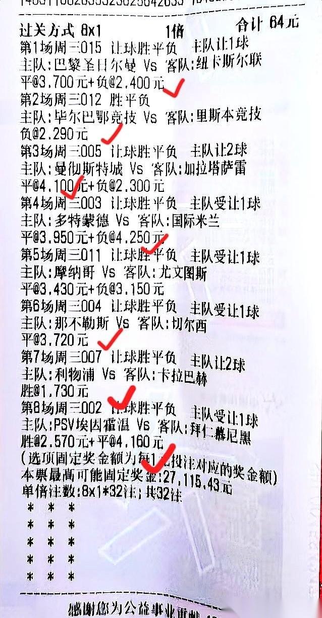我敢说,今晚全天台一半的人,都是被尤文图斯踹上去的。 真的。 眼看着串子就要红了,就差这一场。赔率稳得跟银行存款似的,我连庆祝文案都想好了,结果呢? 结果人家硬生生给你踢了个平局。 那种感觉你懂吗?就好像你跑完了一万米,终点线前一脚踩空了。不是输在实力不济,是输给了命运的玩笑。 比全黑了还难受。真的,全黑了起码死心了,这种就差临门一脚的,能把人气出内伤。 最骚的操作是什么? 是我的任九,千防万防,把这个平局给防住了。偏偏到了要中大奖的14场,脑子一热,觉得“不可能吧?尤文还能不赢?”,然后就漏了。 所有的分析,所有的判断,都对。 就错在,太相信一个“理所当然”了。 生活嘛,总是在你觉得十拿九稳的时候,给你来一记大耳光,告诉你别太嚣张。 算了,不说了。 下一期再说吧。