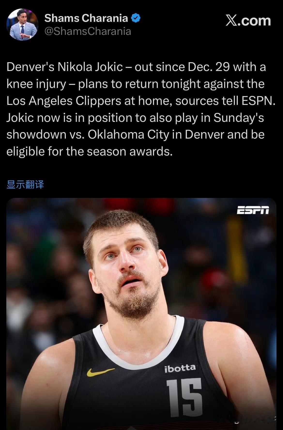 重磅消息!!!约基奇今天复出战快船! 根据记者Shams最新消息透露,掘金迎来利好消息,当家球星约基奇将在今天对阵快船的比赛中复出! 北京时间1月31日上午十点,掘金主场迎战快船,大前锋戈登的伤病让掘金雪上加霜,但是没想到约老师回来了,这对掘金来说真的是最棒的消息了。 约老师已经缺席了多达16场比赛,这对于他这个作战机器来说是很少见的,他是12月30日受伤的,也正好一个月了,今天快船还会那么轻松吗? 不过不确定约老师是已经完全康复还是提前复出,不排除为了赛季奖项提前复出,毕竟需要打够65场才可以的。快船 约基奇 丹佛掘金 NBA掘金