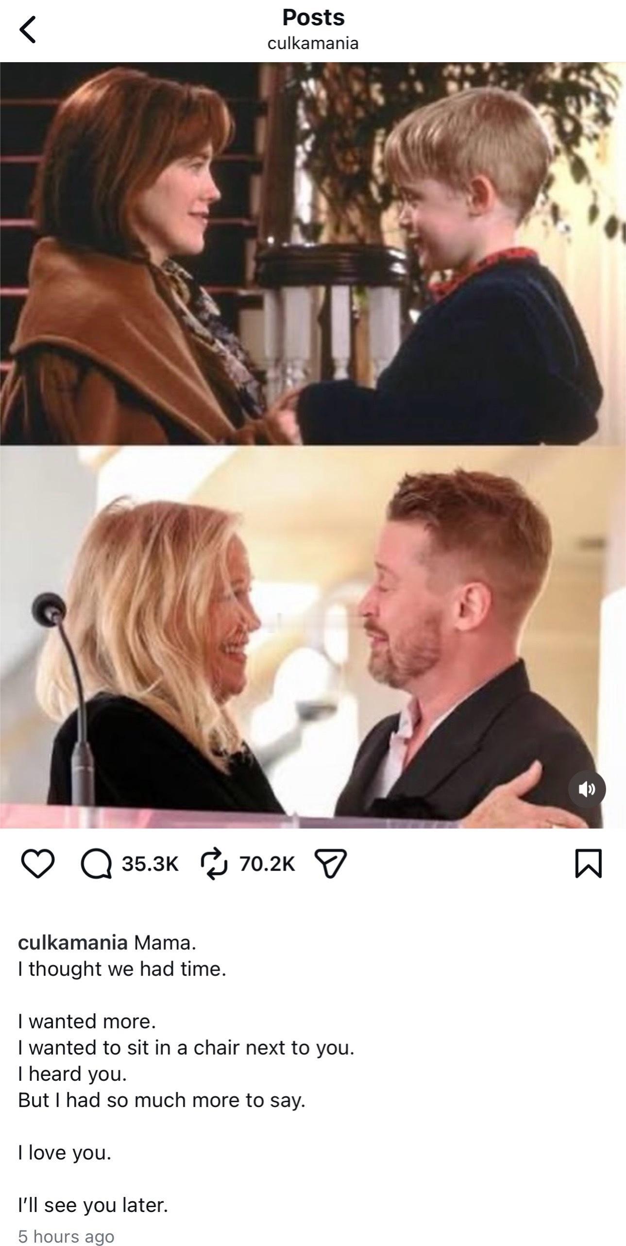 图四:《小鬼当家》里她的儿子扮演者Macaulay Culkin在社交平台发布两人合照,配文“妈妈,我以为我们还有时间,我想要更多,想要坐在你身旁,我听见了你说的话,可我还有太多话没有说出口。我爱你,我们会再见的”…