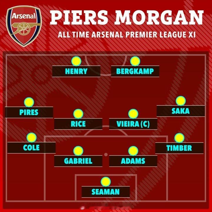 摩根更新社媒评选出阿森纳历史最佳11人,萨卡等四名现役球员入选。具体名单如图。前锋:亨利、博格坎普中场:皮雷、赖斯、维埃拉、萨卡后卫:阿什利·科尔、加布里埃尔、亚当斯、廷伯门将:希曼 英超联赛 阿森纳著名教授