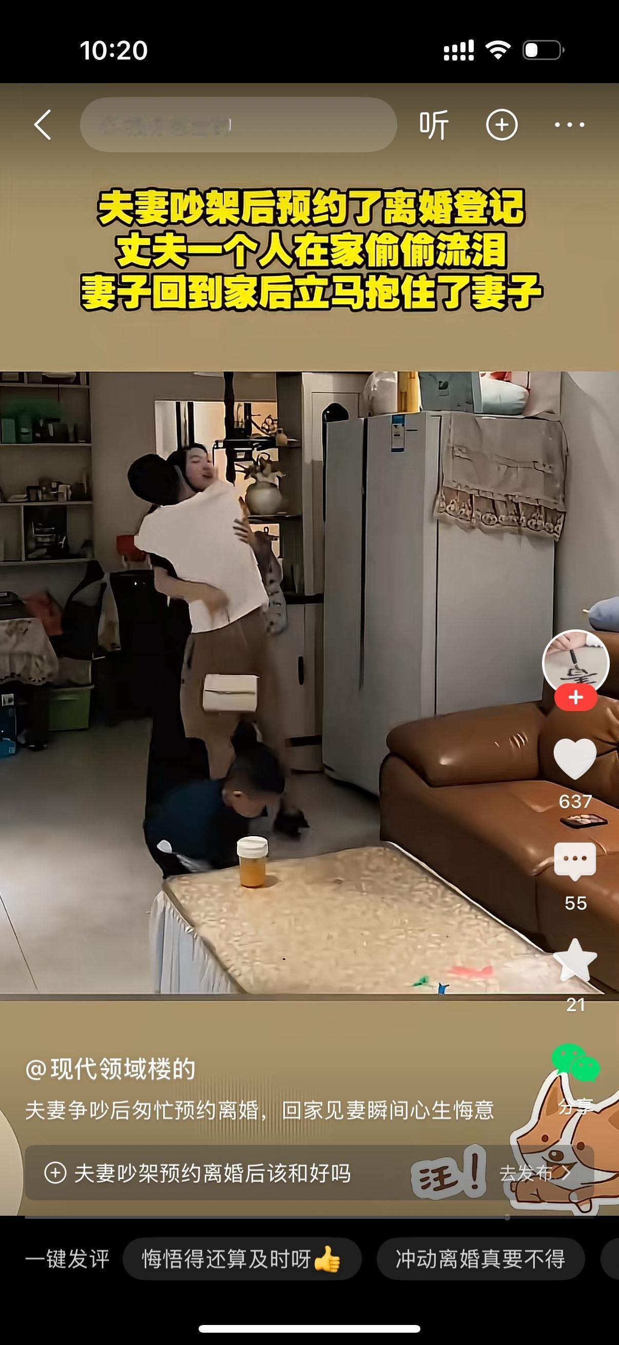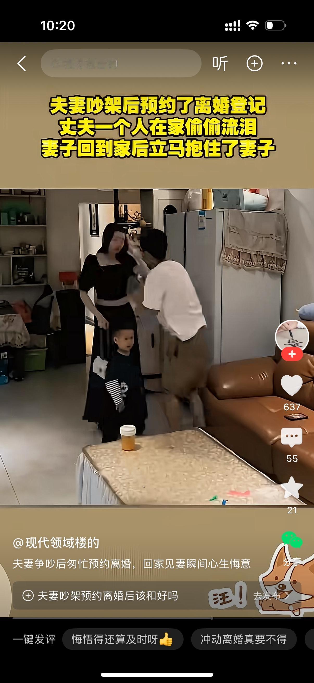 夫妻吵架之后预约了离婚登记。丈夫一个人坐在沙发上偷偷流泪。妻子抱着小孩从外面回来。女人刚把孩子放下,丈夫就从沙发上站起来猛地抱住她,越抱越紧。女人知道男人一定是心生悔意了。但女人什么也没说,她觉得没必要再和一个情绪不稳定的男人过下去了。家暴有一次就会有下一次。现在他悔过了,下次就不记得了。