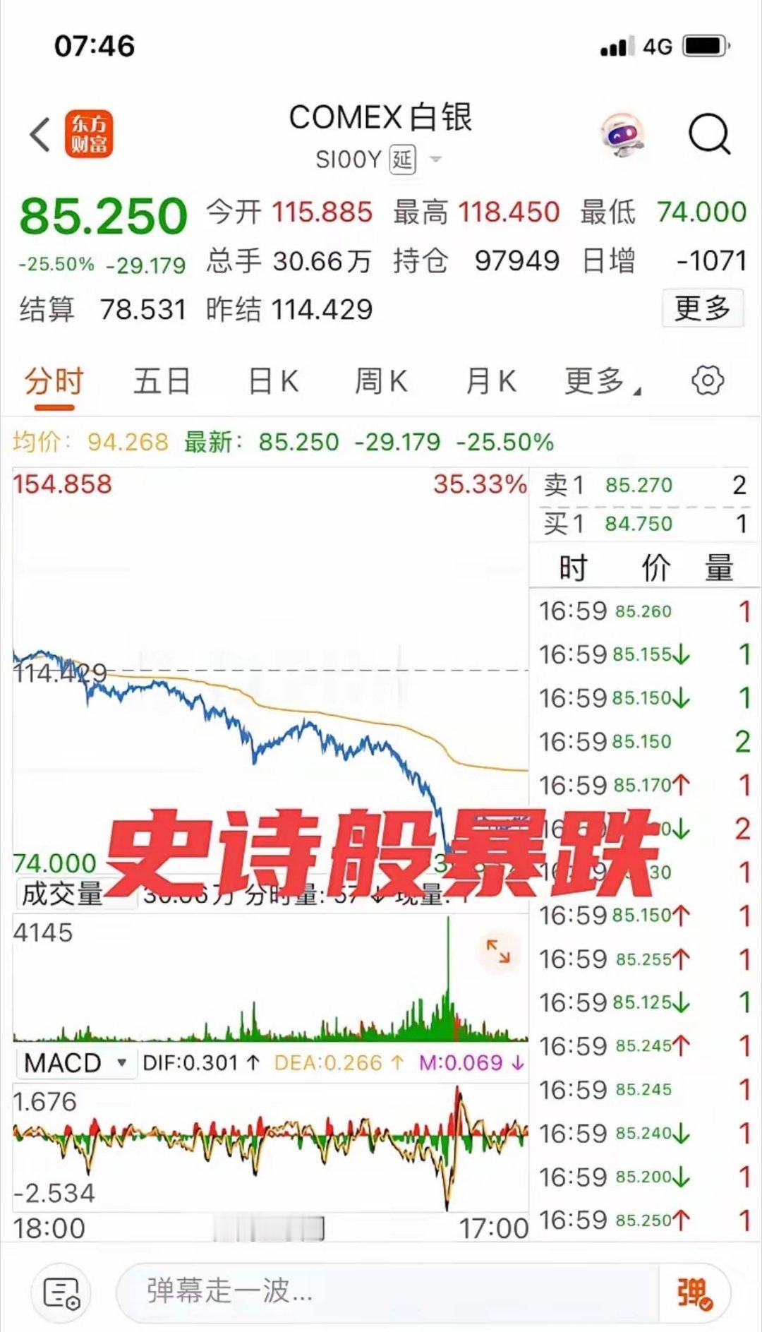 黄金遭遇40年来最大下跌上帝让其灭亡!必先让其疯狂!昨晚的国际黄金创40年最大跌幅,由5400多直接杀到最低4700!昨晚的国际白银也史诗般暴跌,由118杀到最低74,创历史最大跌幅!成也萧何 败也萧何!美元的走强,中东局势的缓和,使得黄金白银由大涨转至大跌,有多少人曾经因此一夜暴富,又有多少人曾经因此一夜倾家荡产,这就是资本的魅力,也是资本的血腥,美国华尔街通过做多赚钱,通过做空亦赚钱!杀完多头杀空头,不得不服华尔街,不得不服美国人!可怜追高买入黄金白银类股票的大A投资者,周一开盘还会大面积跌停!这次黄金白银史诗般的暴跌,给全球投资者上了一课,给大A股民上了一课,那就是不要跟风、不要追高、不要赚最后的铜板!这次黄金白银史诗般的暴跌,不知道把大A多少中产阶层干翻了,股市有风险,生活到处都是坑,稍不小心就被坑,稍不小心就被埋!不管你信不信,下周的大A必将血流成河,黄金白银类股票必将大面积跌停,4000点保卫战已经打响!黄金白银