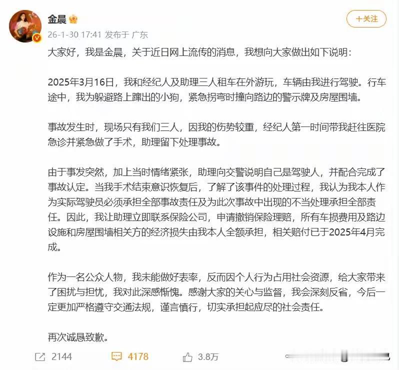 金晨这次危机公关能成功,关键在于态度真诚、节奏精准、闭环清晰,把一场可能塌房的风波稳稳化解。 首先,借官方通报定调,警方明确事故是避让小狗引发、无骗保、顶包是助理慌乱自作主张,直接切断 “逃逸”、“酒驾” 等恶意猜测,给公关打下权威基础。 其次,回应快且全,警方通报后立刻发致歉文,承认自己是驾驶人、担全责,说明离现场是因脸部受伤就医,还晒伤情照、强调主动撤保、全额自费赔偿,把公众关心的问题一次性说清,不留争议尾巴。 再者,姿态诚恳不甩锅,不找借口、不卖惨,只认错反省,既区分了自身与助理的责任,又凸显主动补救的担当,契合大众对 “知错就改” 的期待,最终靠坦荡和高效扭转了舆论。