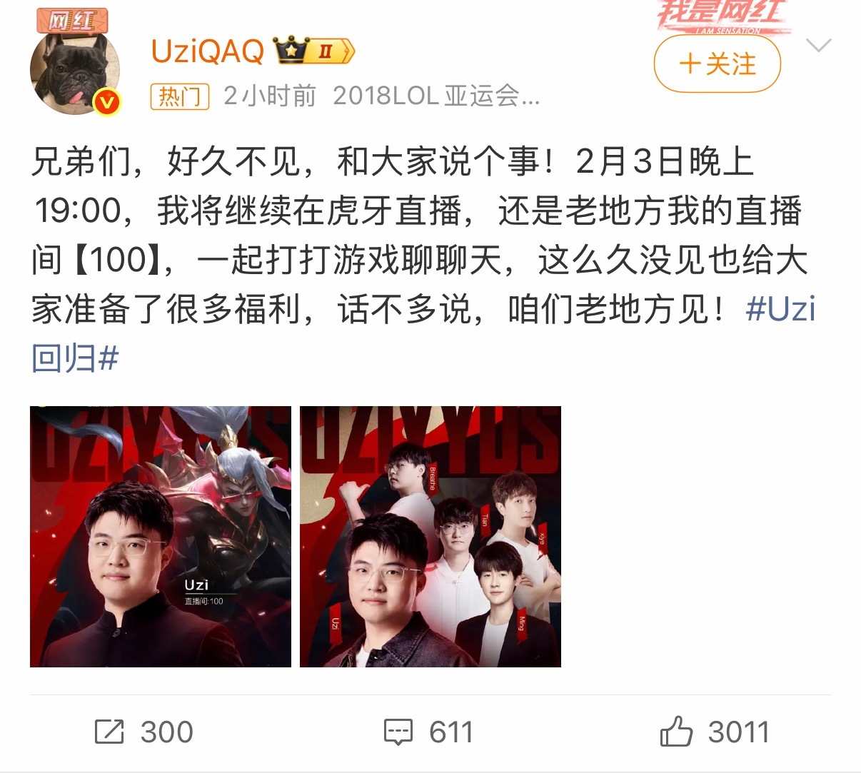 Uzi回归狂小狗回来了!近日Uzi官宣复出,与呼吸哥、Tian、Xiye、Ming组成超级战舰,当然不是复出打职业,而是复出直播!这个阵容要是能打LPL的话,节目效果估计要拉满了!