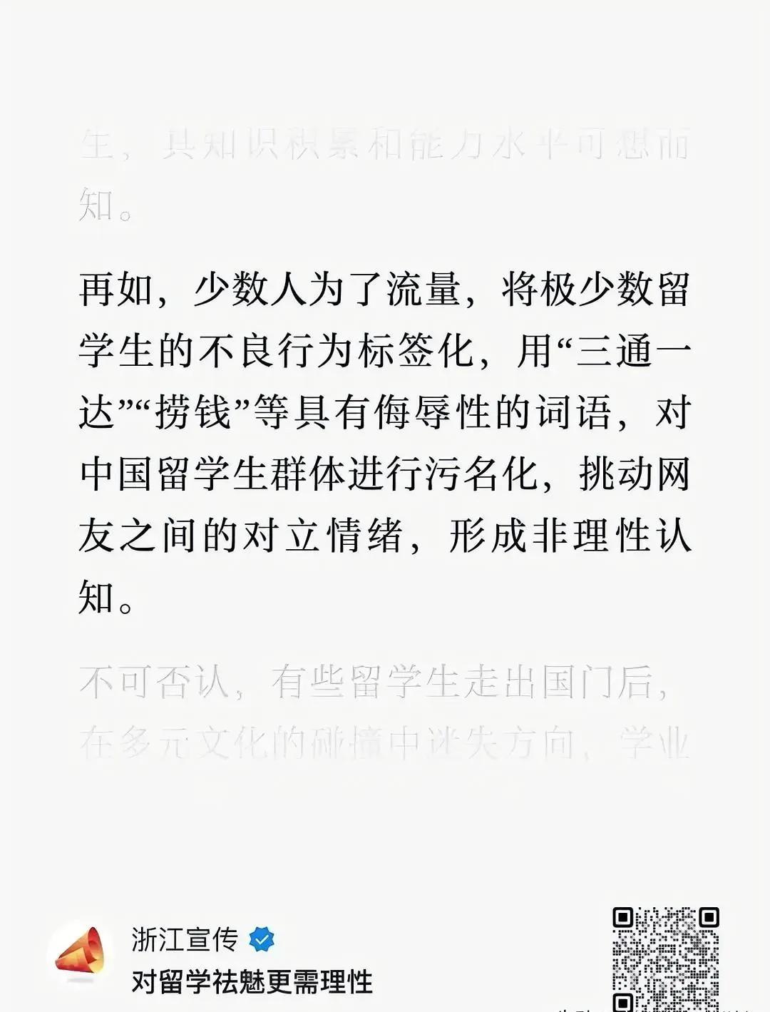 44岁大哥恶补牢A内容才发现,所有人都盯着女留学生的话题,却没人提他后半段话——西方学校里,对守规矩的好孩子的霸凌,才是最细思极恐的! 牢A早就说过,在那些垃圾学校里,不纹身、不嗨玩、不逃课、不碰大麻的孩子,就是“异类”,天生要被针对霸凌;普通霸凌搞不定,就找家里有政客背景的孩子出手整人,这一套完美闭环,把规规矩矩的孩子逼到绝路! 看懂这个就明白,哪是什么所有女留学生自愿沦为“三通一达”?不过是被这种畸形的学校文化逼的!浙江宣传轻飘飘一句“极少数”,要么是别有用心刻意忽略,要么就是罔顾事实,这波操作是真的不厚道! 更打脸的是,那些跳出来证明牢A说的是假的留学生,最后全被扒出私下玩得花,事实摆在眼前,嘴硬根本没用! 老祖宗早就教过:君子不入危邦,不立危墙之下。那些连基本做人底线都没有的禽兽不如之地,本就该避而远之,远离危险,才是立身保命的根本!
