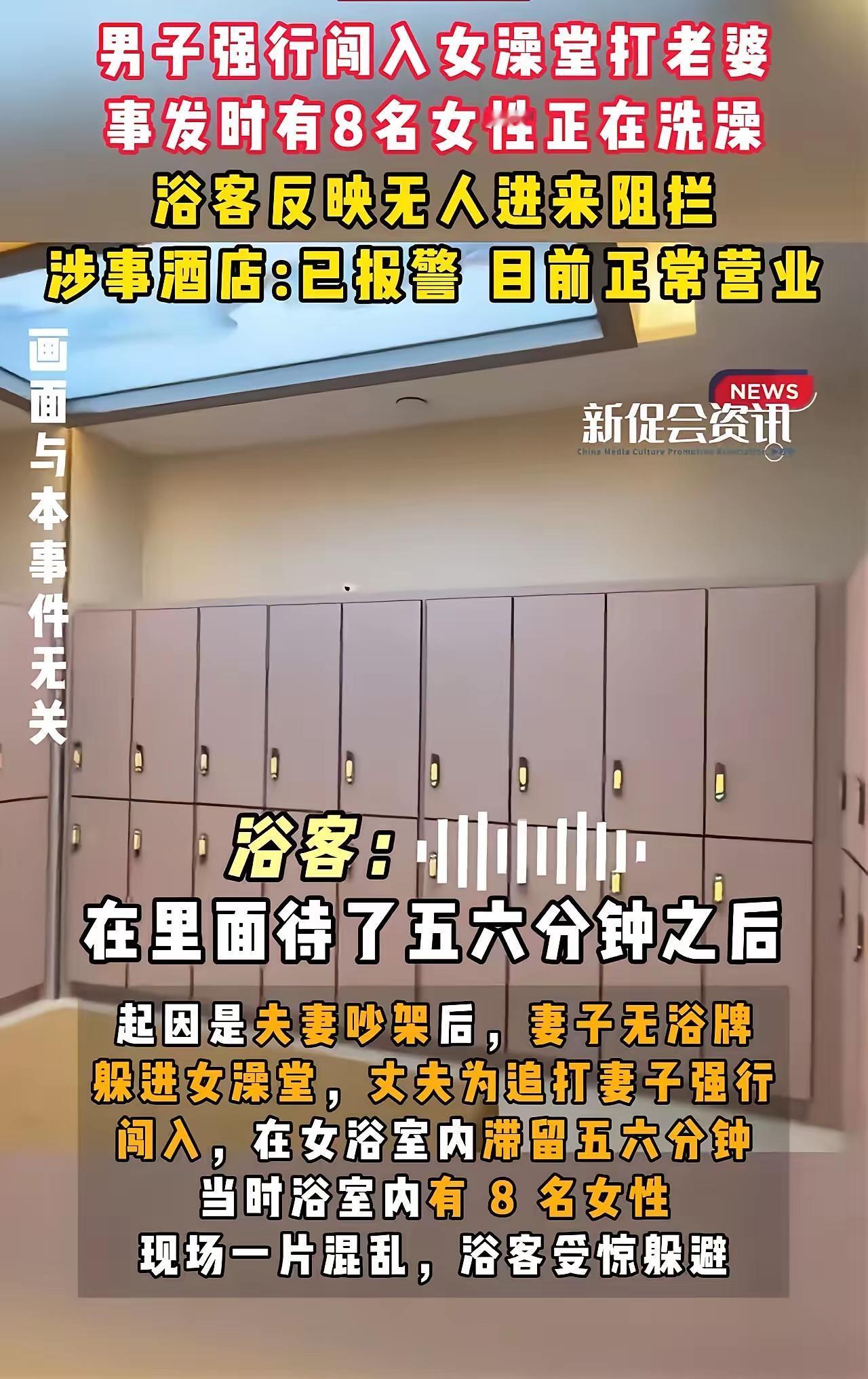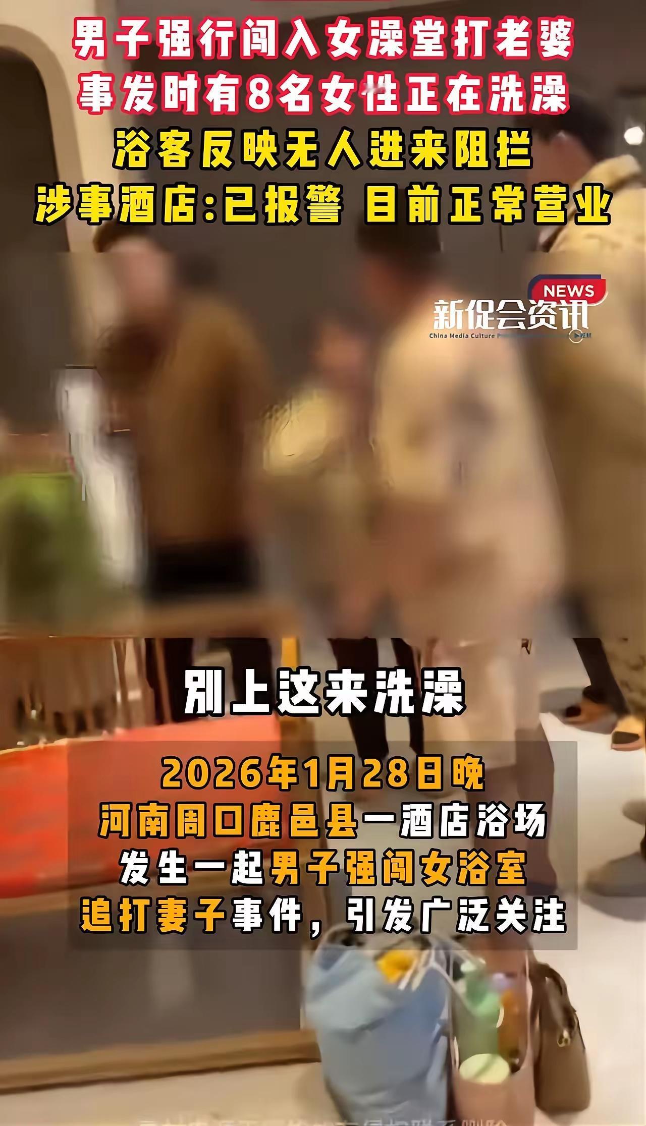 “公开耍流氓” 1月28日,河南周口鹿邑县一酒店浴场 一男子强闯女浴室,殴打妻子。 当时,浴室里有共8名女子在泡澡。 几名女子在男子闯入后,手忙脚乱拉扯毛巾遮挡身体,还导致打滑摔倒的,惊叫声不断…… 可,男子闯进女浴室,殴打妻子前后6分多钟时间,酒店服务人员才反应过来制止和报 警。 这反应过于慢。 事后,酒店就拿出20张/人泡澡券,补偿客户。 只能说,这补偿只会加剧受害者的痛处。 不说受害者的痛楚。 有一点疑问: 女客户的泡澡室外,为何没有一名服务员守在门口安全处呢? 这个难道不是最基本的保护客户安全和隐私的最基本环节之一? 事件前后共6分多钟,服务人员才反应过来,这太不合格了。 不让人,往歪处想都不行啊! 女孩子,出门在外真的非常需要保护好自己。 这个荒唐的闹剧,暴露整个酒店安全系统的不足。 关于酒店对受害者的补偿,你有什么想说的?
