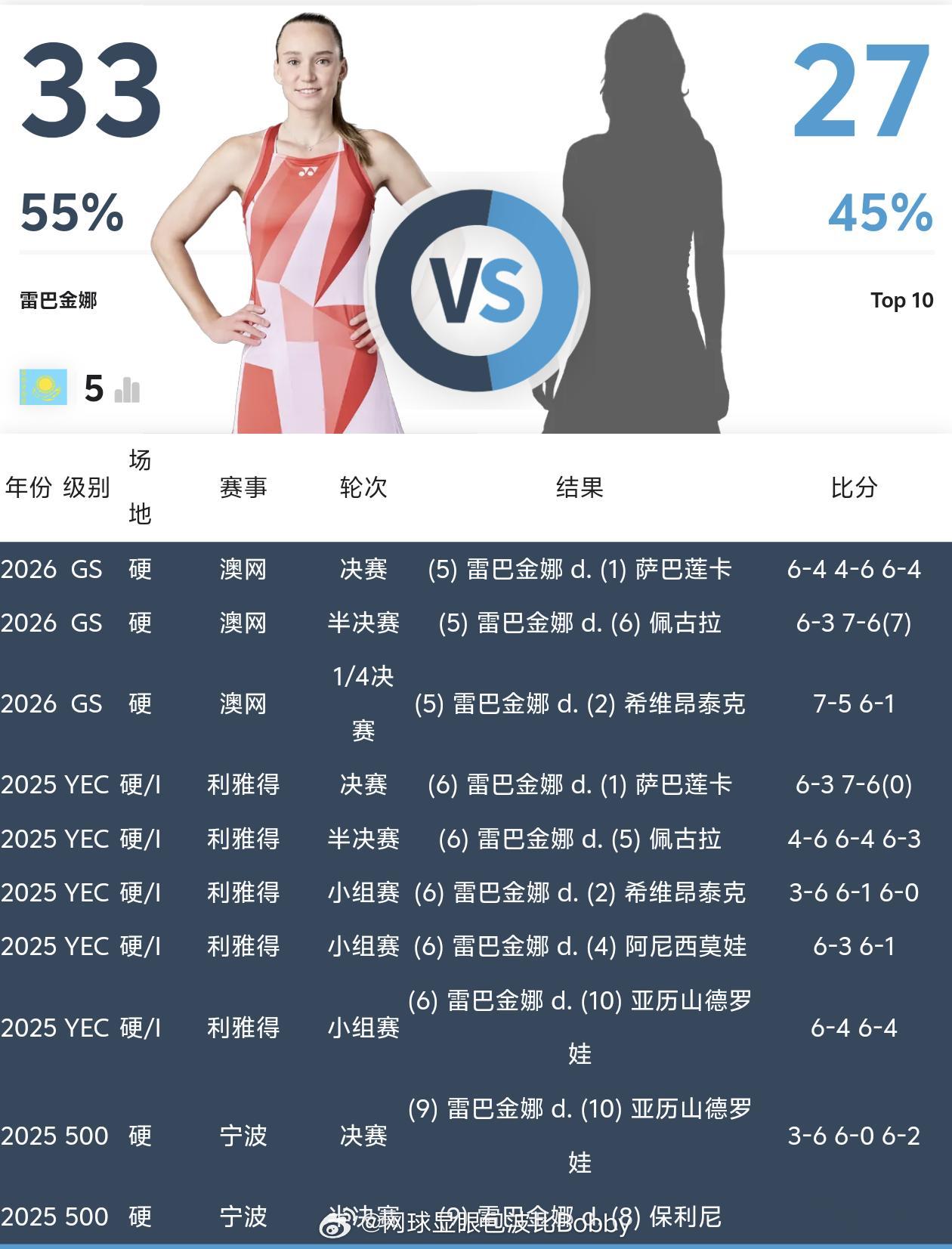 莱巴金娜第33次战胜top10对TOP10,十连胜✅✅✅✅✅✅✅✅✅✅ 萨巴伦卡
