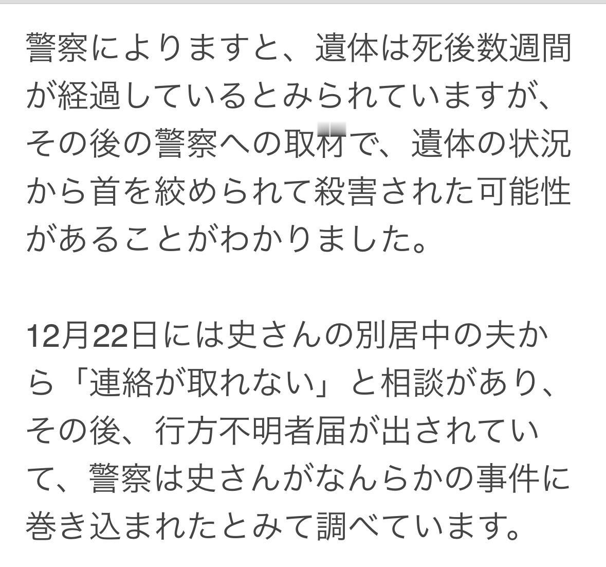 1月27日,在茨城县筑波市的山林中,发现了中国女性54岁史某的遗体,遗体衣着完整,但未穿鞋,已死亡数周,可能是被勒死的。 12月22日,已经和史某分居的丈夫联系警方,称:联系不上她。随后挂失踪立案。警方正在调查她是否卷入某种事件。