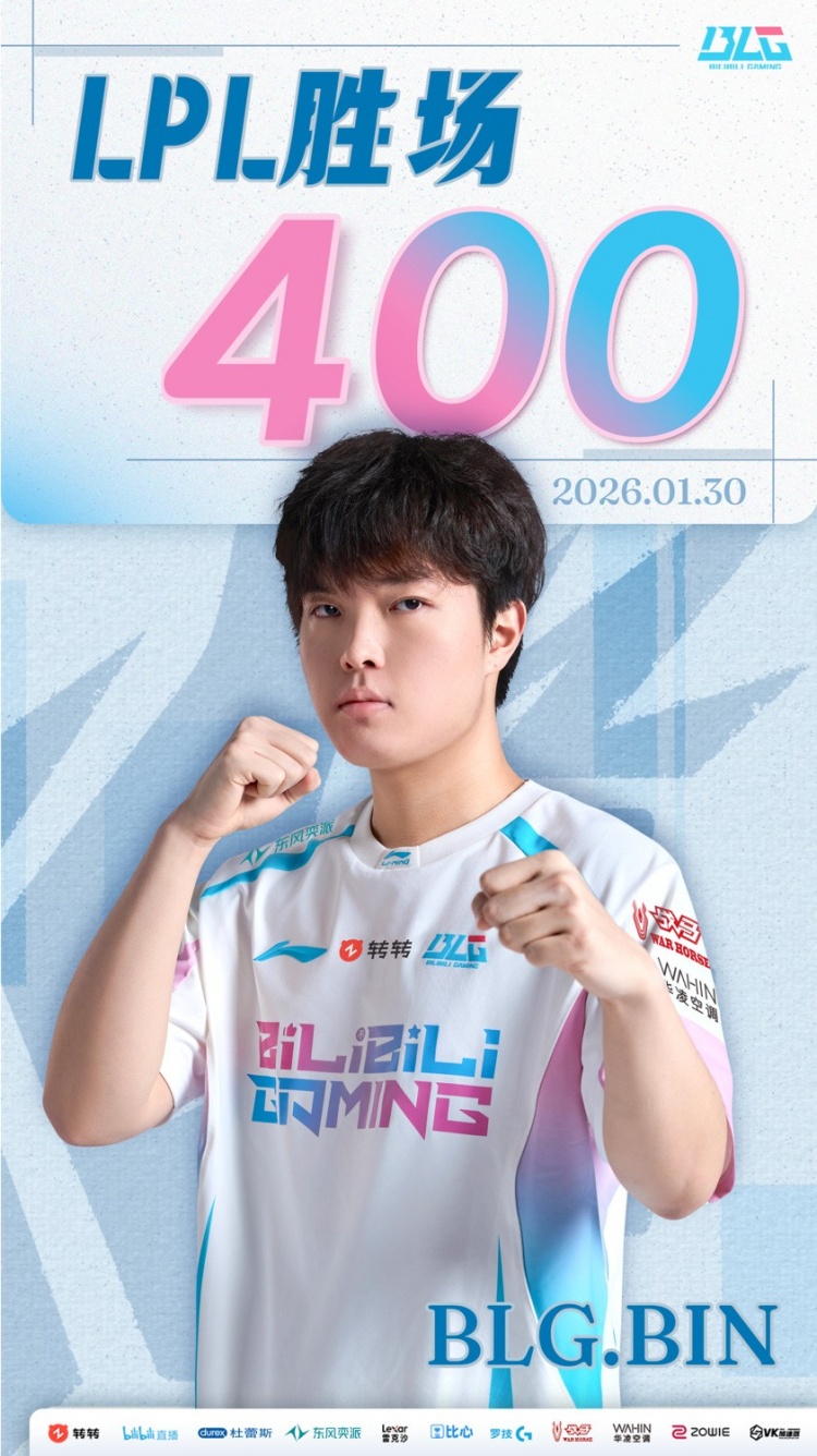 BLG官方:Bin在对阵IG的比赛中使用兰博达成LPL400胜场里程碑!