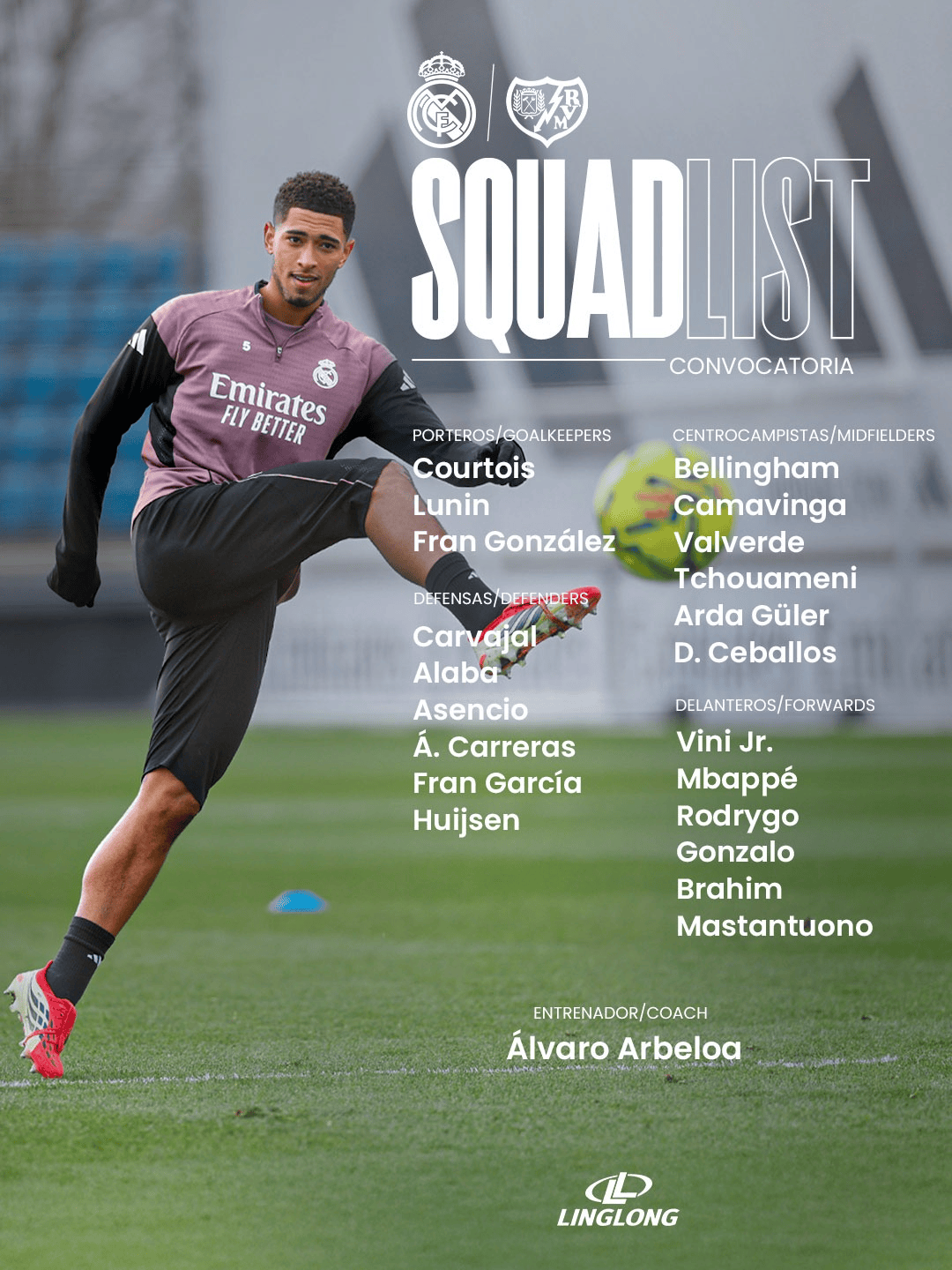 虎扑01月31日讯北京时间2月1日晚21时,2025-26赛季西甲联赛第22轮,皇家马德里坐镇伯纳乌球场迎战巴列卡诺闪电。赛前皇马公布了本场比赛的大名单。