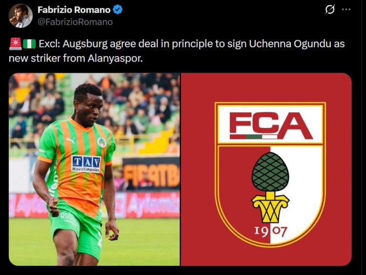 罗马诺写道:“独家消息:奥格斯堡就签下新前锋乌琴纳·奥贡杜,与阿兰尼亚体育达成原则性协议。”