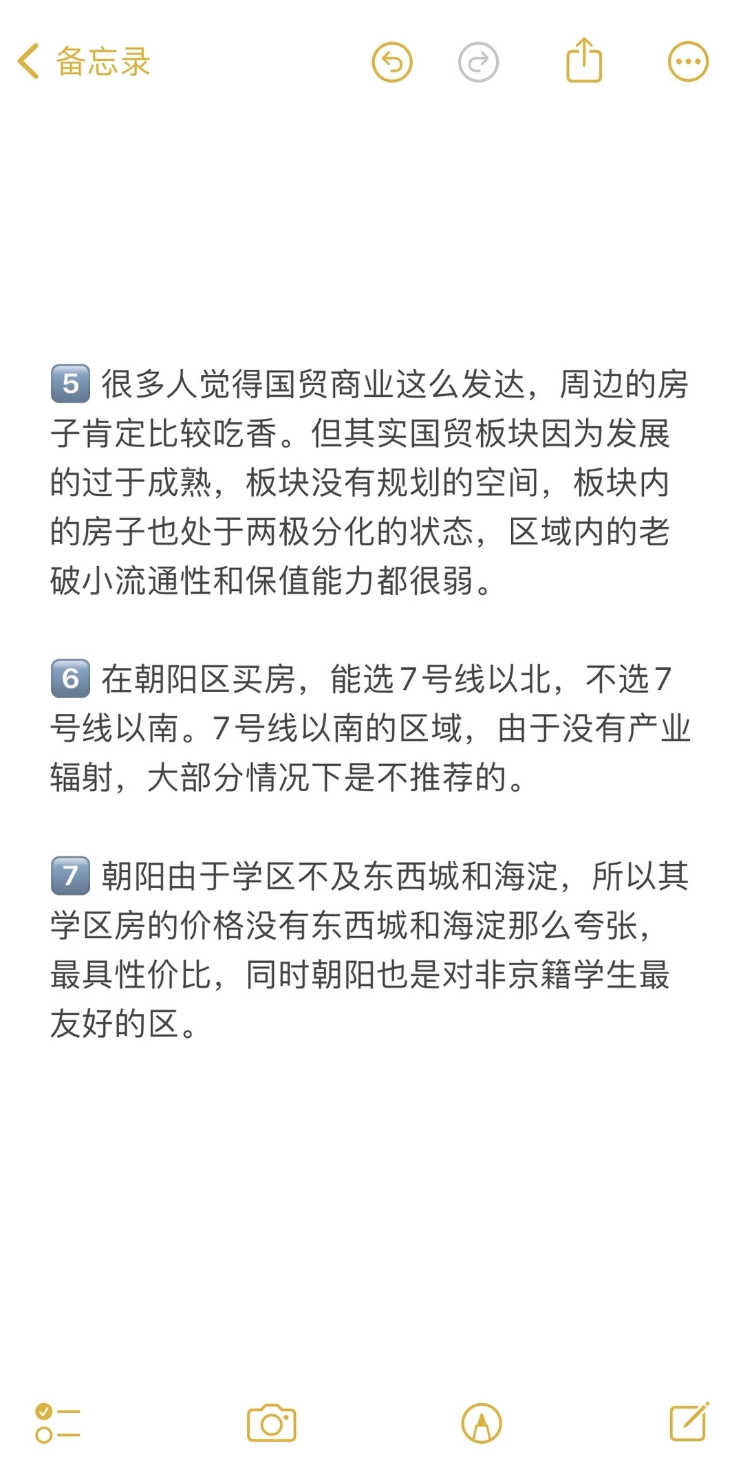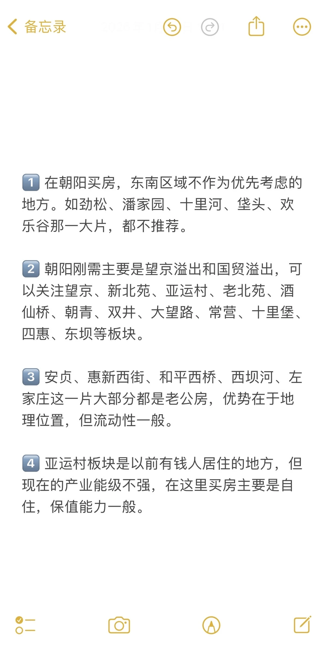 1️⃣ 在朝阳买房,东南区域不作为优先考虑的地方。如劲松、潘家园、十里河、垡头、欢乐谷那一大片,都不推荐。 2️⃣ 朝阳刚需主要是望京溢出和国贸溢出,可以关注望京、新北苑、亚运村、老北苑、酒仙桥、朝青、双井、大望路、常营、十里堡、四惠、东坝等板块。 3️⃣ 左滑图片,查看更多内容!