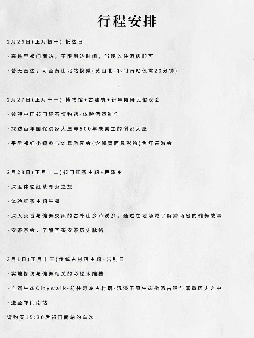 2月27日-3月1日 春节档,我们安排了新年傩舞游园会,鱼灯巡游,祁门红茶深度体验,传统古村落探访,洪家谢家双屋古建筑学习📑,瓷石博物馆泥塑体验等内容,期待你在春节氛围仍在的三天里,收获快乐也收获知识~