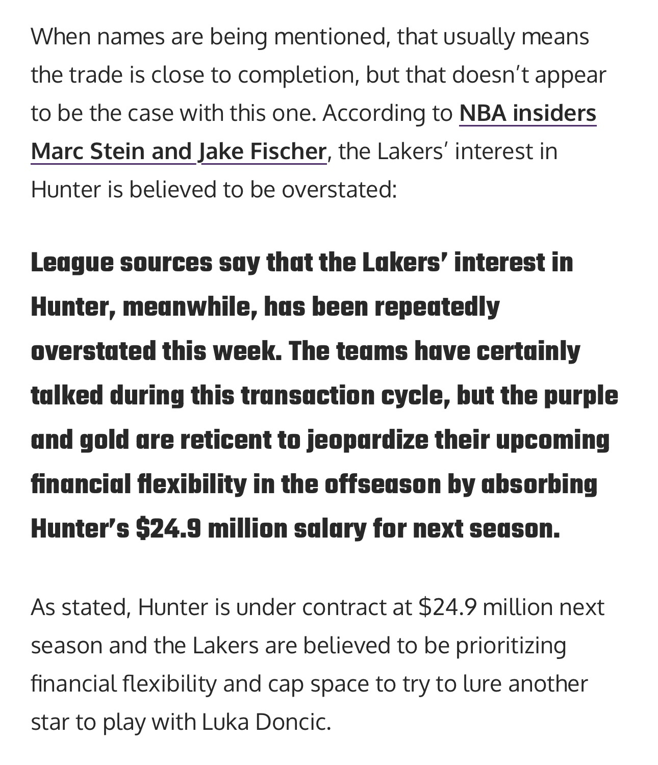 “湖人对亨特的兴趣被反复夸大了,两队在本次交易窗口期确实有过沟通,但湖人不愿为了接纳亨特下赛季2490万美元的薪水,而损害他们休赛期即将获得的财务灵活,湖人目前正优先保障薪资空间和财务灵活,以便吸引另一位球星来和东契奇搭档。”