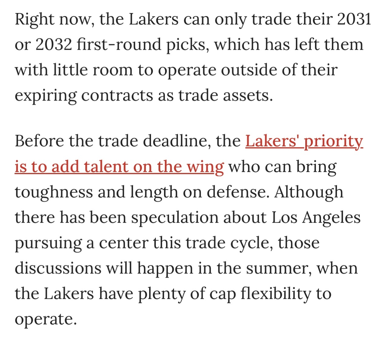 和骑士一样,这种交易方案必须引入至少另一支球队参与,但湖人在和那些能在交易截止日承接薪资的球队谈判时陷入了困境,原因就在于他们的选秀资产储备过于薄弱。湖人除非能完成类似去年太阳队那样的首轮签交易,否则不愿轻易送出未来选秀权。