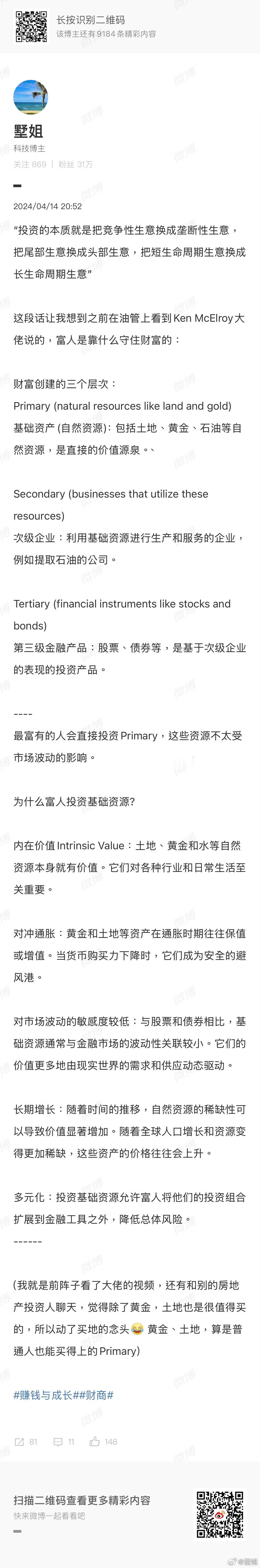 美国有钱人如何守财?土地、黄金、自然资源/基础资源。几年前分享过的一段话:“投资