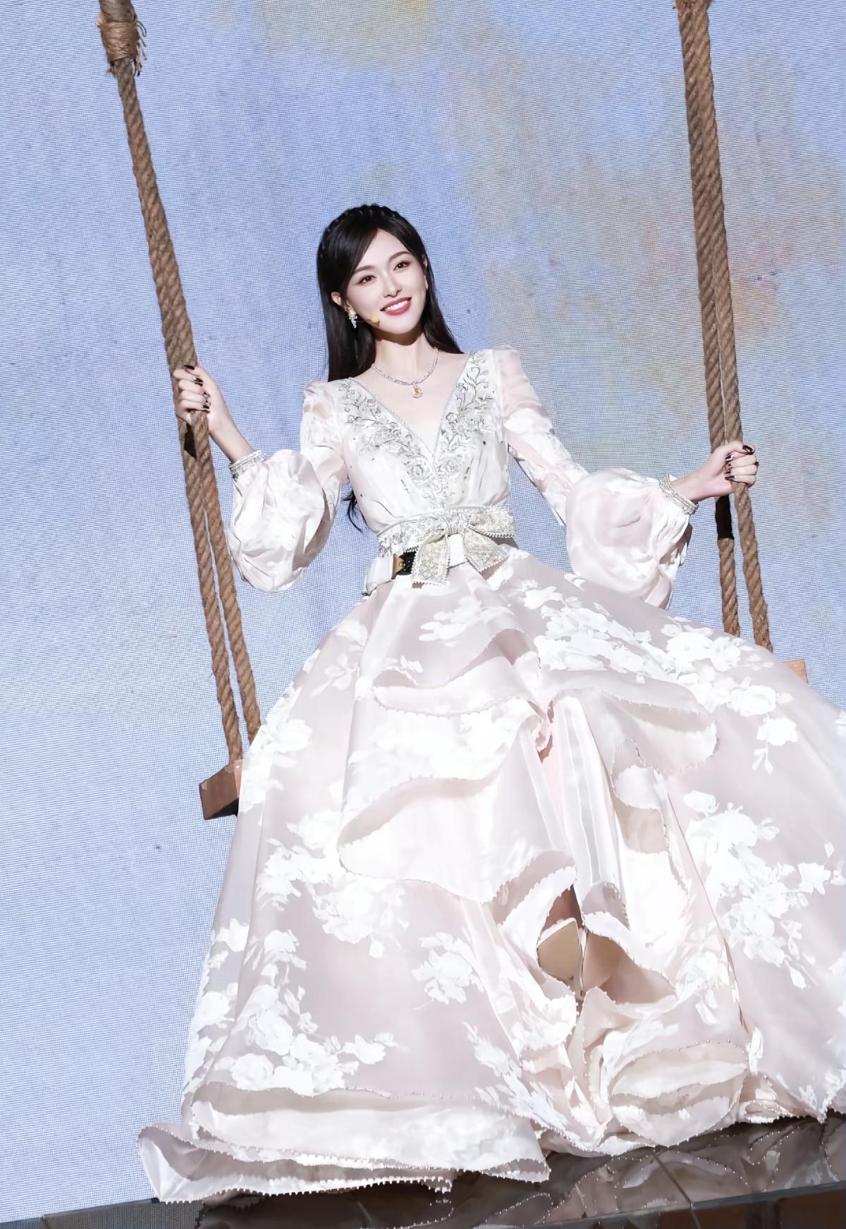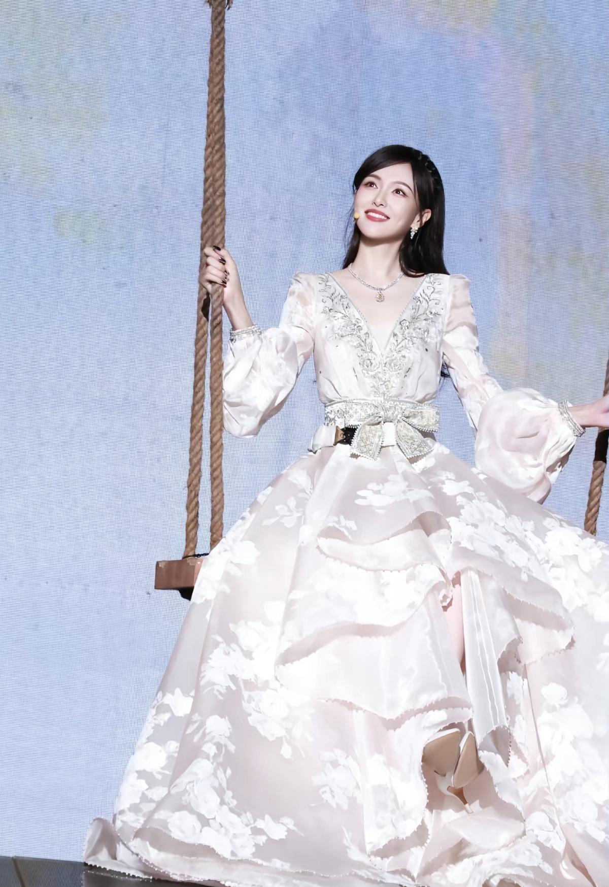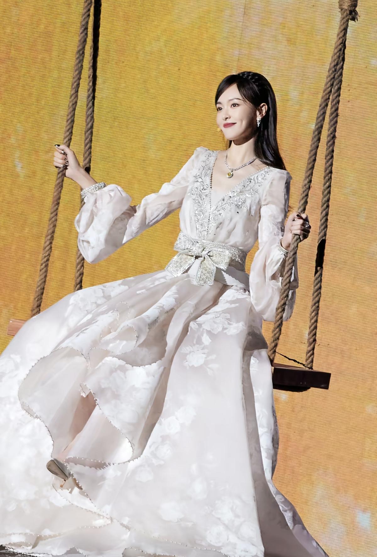 唐嫣的秋千造型太治愈了!浅米白礼服裙自带柔光滤镜,浅笑的样子温柔又美好,是心动的