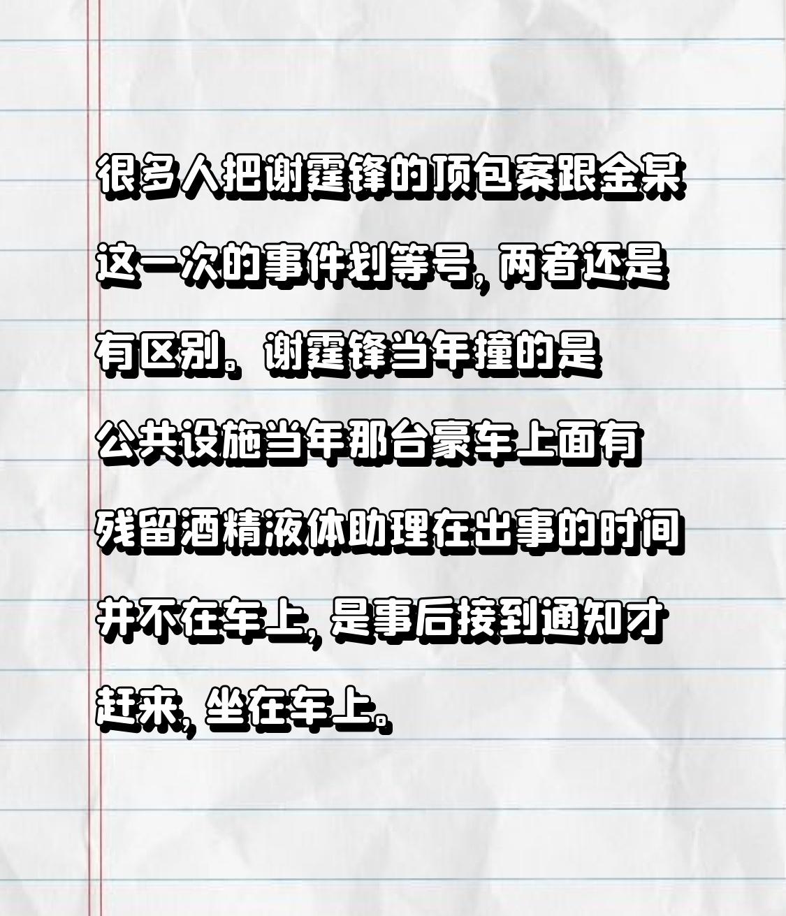很多人把谢霆锋的顶包案跟金某这一次的事件划等号,两者还是有区别。 1.谢霆锋当年撞的是公共设施 2.当年那台豪车上面有残留酒精液体 3.助理在出事的时间并不在车上,是事后接到通知才赶来,坐在车上。 这3点就可以看得出来 金某的顶包和谢有明显区别,若要说宽容,当年香港对谢霆锋确实很宽容。