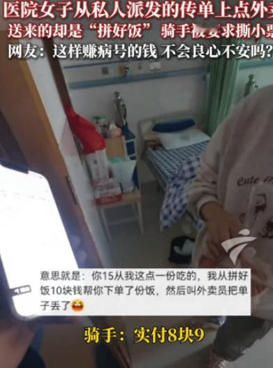 “万万没想到!”广东,女子在医院陪护时花15元点了一份外卖,不料,外卖小哥送餐时却突然问了一句“谁给你点的?”女子不明所以,听完外卖小哥解释后,她才明白,这份餐还被赚了6块钱差价! 女子小林(化名)在医院陪护住院的母亲,已经连续熬了好几天。病房里消毒水味混着饭菜味,一到中午就格外明显。 母亲刚做完检查,人有些虚弱,小林坐在床边,胃却早就咕咕叫了起来。 她掏出手机,习惯性地点开外卖软件。可翻了好几页,眉头越皱越紧——不是麻辣烫,就是酸辣粉、螺蛳粉,还有各种重油重辣的快餐。 平时在公司还能将就,可现在是在医院,她一想到那些油辣味,胃就一阵不舒服。 “算了,还是吃点清淡的吧。”她正准备关掉软件,旁边病床陪护的大姐忽然凑过来,小声说:“你要是不想吃外卖平台上的,可以试试私人点餐,我昨天点的,便宜还清淡。” 小林一愣:“私人点餐?” 大姐给她看了一个微信小程序,说是附近有人专门做病号餐、陪护餐,中午现做,有人接单后再叫骑手来取。 页面看起来挺正规,菜品也简单:清炒青菜、蒸蛋、白切鸡、小份米饭。价格标着15元一份,看着不算贵。 想着能吃口热乎清淡的,小林也没多想,直接下了单。 下单后不到二十分钟,手机响了。外卖小哥到了楼下,她下楼去取。骑手把餐递给她的时候,却多看了她一眼,语气有点迟疑地问了一句: “这个餐……是谁给你点的?” 小林一时间没反应过来,下意识回答:“我自己点的啊。” 骑手又追问了一句:“不是别人给你点的吗?” “不是。”小林有些疑惑,“我在外卖单点的,有人派单的时候点的。” 骑手听完,皱了皱眉头,低头看了看手里的小票,又抬头看她:“那怎么会让我把小票撕掉?” 这句话,直接把小林说懵了。 “撕小票?为什么要撕小票?”她下意识反问。 骑手叹了口气,语气里带着一点无奈:“因为这是拼好饭的单子啊。” “拼好饭?”小林声音一下拔高了,“不可能吧?我点的是15块钱的。” 骑手见她一脸震惊,索性把话说明白了:“你这个餐,在我们这边系统显示,原价是8.9元。属于那种拼单优惠餐。正常情况下,小票是要留给顾客的,但商家备注让我撕掉。” 这一刻,小林脑子“嗡”的一声。 8.9元? 那她付出去的15块钱算什么? 她低头看着手里的餐盒,普普通通的两样菜一份米饭,连一次性餐具都不是独立包装。她突然意识到,自己并不是点了什么“私人定制陪护餐”,而是被人换了个壳。 骑手看她脸色不对,又补了一句:“最近医院这边挺多这种单子。有人专门接拼好饭,再加价转卖。我们骑手也挺为难的,说了怕被投诉,不说又觉得不太合适。” 小林只觉得一股火气直往上冲。不是心疼那几块钱,而是那种被算计、被当成“信息差对象”的感觉,让人说不出的难受。 她回到病房,越想越气,索性把整个经过发到了网上。原本只是想吐槽一下,没想到帖子很快就炸了。 评论区瞬间沸腾。 “连医院陪护的钱都要薅?太缺德了吧。” “拼好饭8.9,转手卖15,脸都不要了。” “这不就是倒卖吗?而且还故意让骑手撕小票,太恶心了。” “赚差价我能理解,但在医院搞这种操作,良心不会痛吗?” 还有不少网友现身说法,说自己也遇到过类似情况: ——“我在医院点的‘营养餐’,后来发现是拼单外卖。” ——“怪不得有的商家不让给小票。” ——“原来不是我多心,是真的有人在中间赚这个钱。” 更让人愤怒的是,有骑手留言证实,这种操作并不是个例。 一些人专门盯着医院、病区、陪护人群,打着“清淡”“定制”的旗号,把拼好饭、低价套餐重新包装,加价出售。价格不高,差价不大,但胜在量多、对象“好宰”。 “他们就是赌你忙、累、没空细看。” “尤其是陪护的人,哪有精力一单一单去核对。” 小林看着这些评论,心里五味杂陈。她突然明白,为什么骑手会多问那一句——那不是多嘴,而是善意的提醒。 事情发酵后,不少网友直言:“什么钱都想挣,但有些钱,真不该挣。” 医院,本该是最需要良心的地方。陪护的人已经身心俱疲,却还要被人算计几块钱的差价。这不是生意精明,而是赤裸裸地利用他人的无力和匆忙。