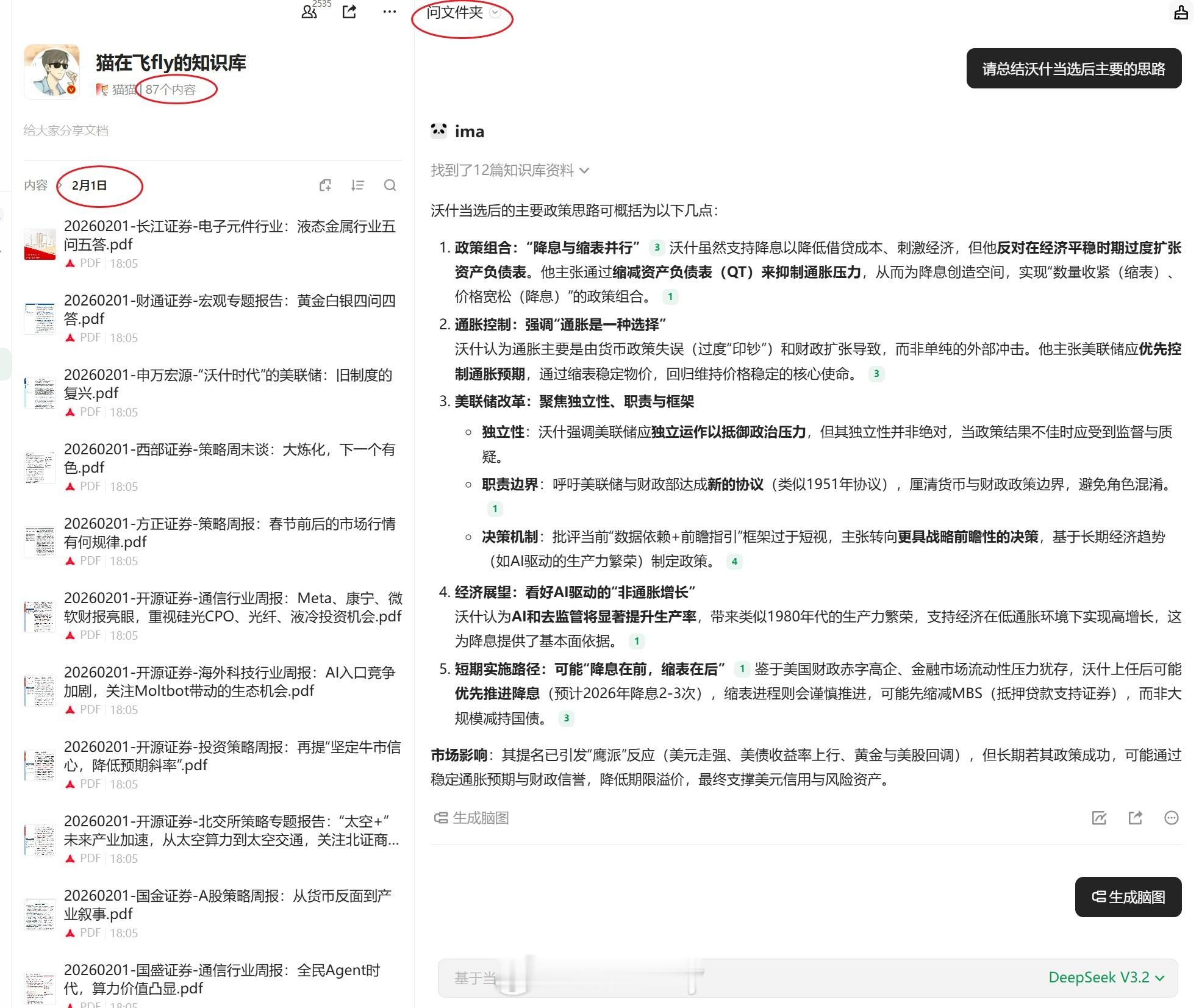 有小伙伴进了铁粉群,也加了知识库却不知道怎么用,还一天问豆包,猫来给大家讲下怎么用简单的来说就是知识库已经给你剔除了很多可能出现的”坑“,知识库里的内容都是券商研报,外文资讯,不是那种小作文,从内容上至少券商帮你筛了一遍。。 有小伙伴说猫你一下上传那么多,我看不过来啊。。 猫也看不过来。。但现在有AI了啊,没时间一篇篇看,你还没时间问AI啊。。 直接问知识库就可以了啊。。 比如你想知道太空光伏有哪些概念,先选模型,比如DS,直接问整个知识库(内容更全) 除了可以问整个知识库,还可以问某个文件夹,比如今天弄的这个2月1日文件夹,猫就上传了一些最新最热的研报,比如想知道最新的沃什的理念,问文件夹就行了嘛(见图2) 这不比你问百度问豆包要专业?至少内容来源都正,没幻想。。 学会了吧。。。