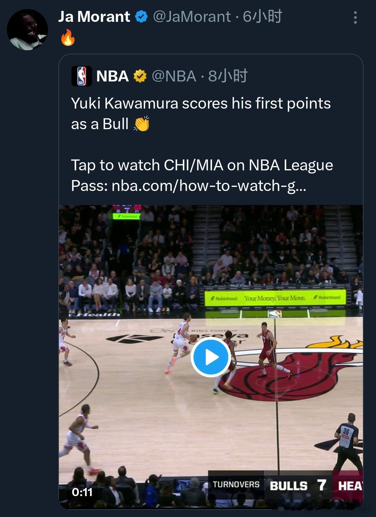 莫兰特转发支持河村勇辉公牛生涯首分:🔥莫兰特nba