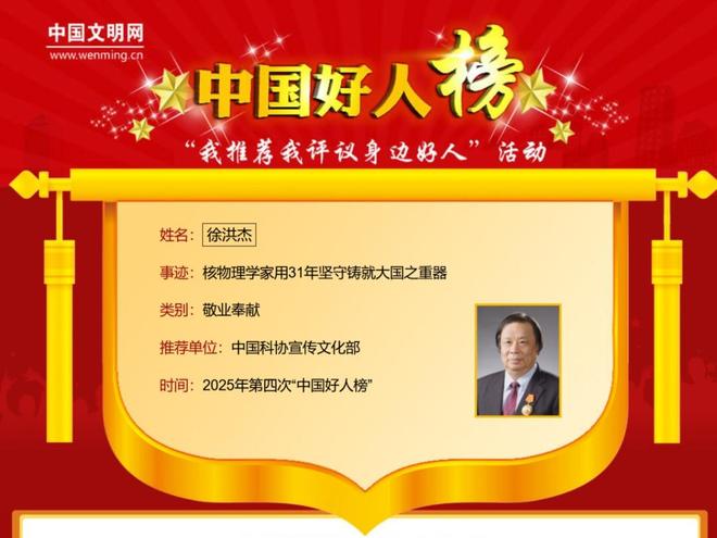 近日,由中央精神文明建设办公室主办的2025年第四批“中国好人榜”揭晓。中国科学院上海应用物理研究所原所长徐洪杰入选“中国好人榜”敬业奉献类身边好人。