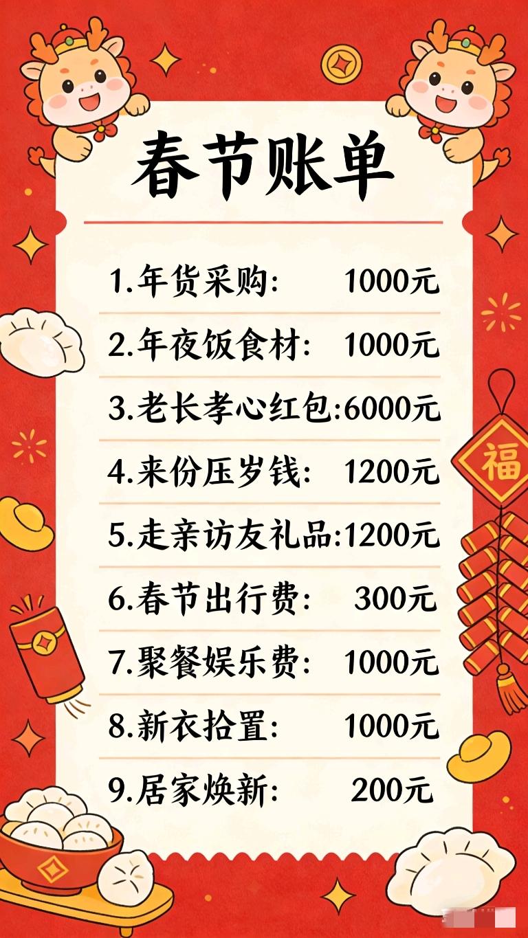 过年要花多少钱?消费预算如下: 1、年货采购:1000元 坚果零食、糖果水果、米面油、对联福字、酒水饮料! 2、年夜饭食材:1000元 鸡鸭鱼肉海鲜样样有,凉菜热菜汤品配齐。 3、长辈孝心红包:6000元 给爸妈、婆婆公公的新年红包,是心意也是陪伴! 4、晚辈压岁钱:1200元 亲戚家的小朋友,一人200元,5-8个孩子的标配,包少了拿不出手。 5、走亲访友礼品:1200元 烟酒茶、各种礼盒,去亲戚家串门。 6、春节出行费:300元 自驾油费,走亲戚、逛庙会的交通成本,近郊出行得这个数。 7、聚餐娱乐费:1000元 同学聚会、朋友小聚、家庭K歌/看电影,过年难得相聚,热闹一下钱都没了。 8、新衣添置:1000元 大人小孩各买一身新衣服,新年穿新衣。 9、居家焕新:200元 添点新餐具、买些绿植装饰,家里焕然一新迎新年! 总计:12900元 辛辛苦苦干一年,一朝回到解放前[捂脸] 你们过年都花多少?都来说一说! 过年花销 过年费用 普通人过年开销 年货选购攻略 年货清单 过年清单