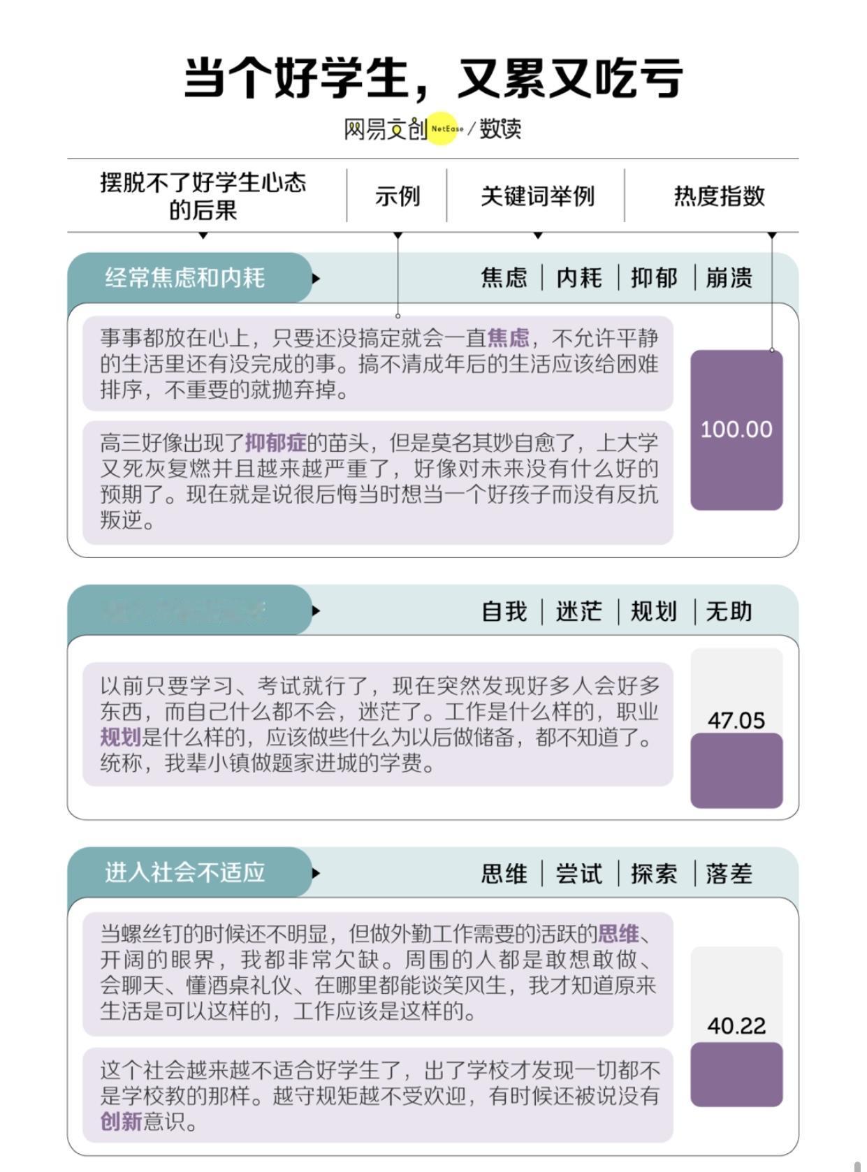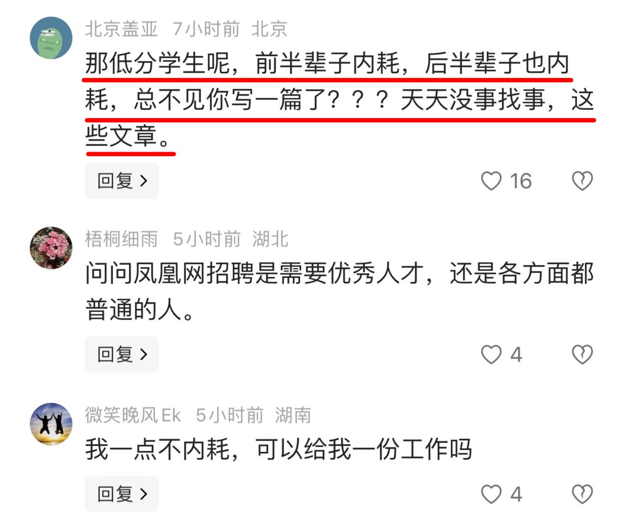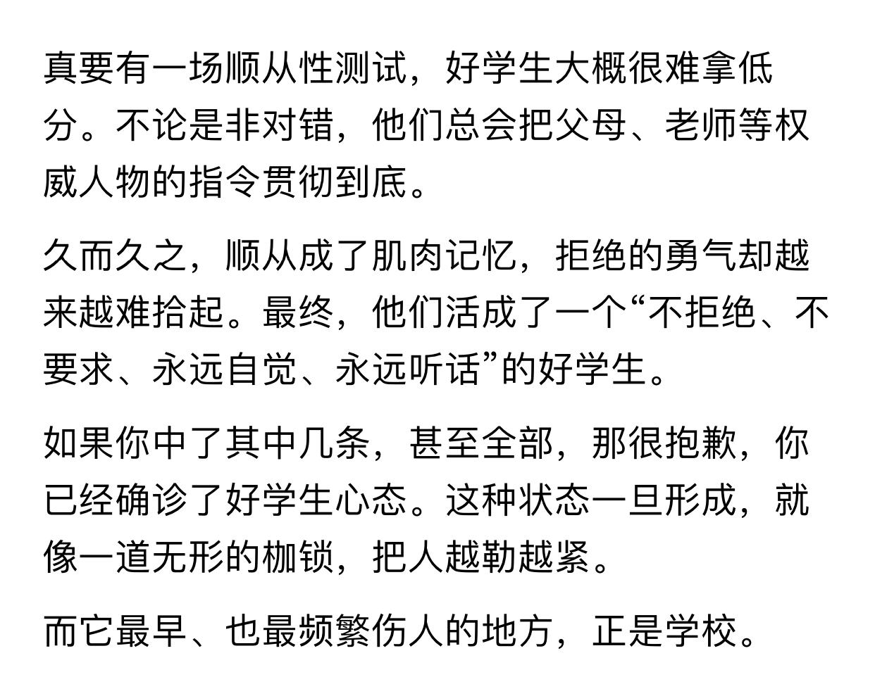 凤凰WEEKLY发长文讲【东亚好学生】(实际内容是中国学生),列数据做图表,核心观点就是“当好学生又累又吃亏”,是从东亚病夫这个词里得到启发还是觉得更高级不清楚,但明明直接讲中国好学生就行,偏偏要用“东亚”这个词,让人听着很别扭。讲了半天就是劝家长不要“专制”学生不要那么追求当好学生。评论区反倒格外清醒,有一个观点很有代表性:高分学生如果不好,那低分学生一生内耗为什么不说。