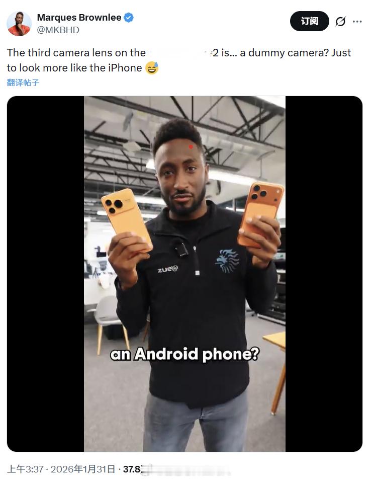 X博主MKBHD对一个手机的评价。MKBHD在油管上有2070万粉丝,X上有61